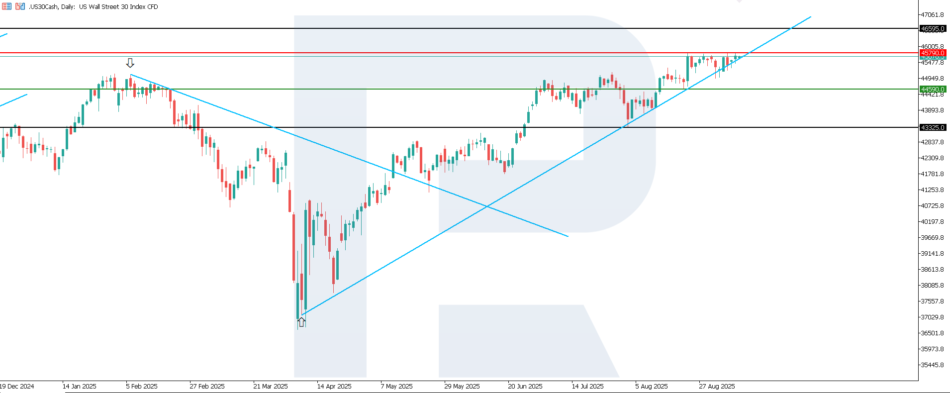 Федералды резерв саясаты тұрғысынан жұмыссыздықтың болжамға сай болып, бірақ сәл жоғары болуы еңбек нарығы мен инфляция деректері әлсірей берсе, жұмсақ ұстанымға негіз бола түседі. Акциялар үшін бұл қысқа мерзімді траекторияның екі күштің тепе-теңдігіне байланысты екенін білдіреді: төмен мөлшерлемелерден қолдау және өсімнің баяулау тәуекелдері үшін жасалатын дисконт. Базалық сценарий – кірістіліктің төмендеуі аясында US 30-дың бейтараптан позитивті реакциясы, бірақ алдағы еңбек нарығы мен инфляция деректеріне жоғары сезімталдық сақталады. Келесі өрлемелі мақсат 46,595.0-де тұр.
