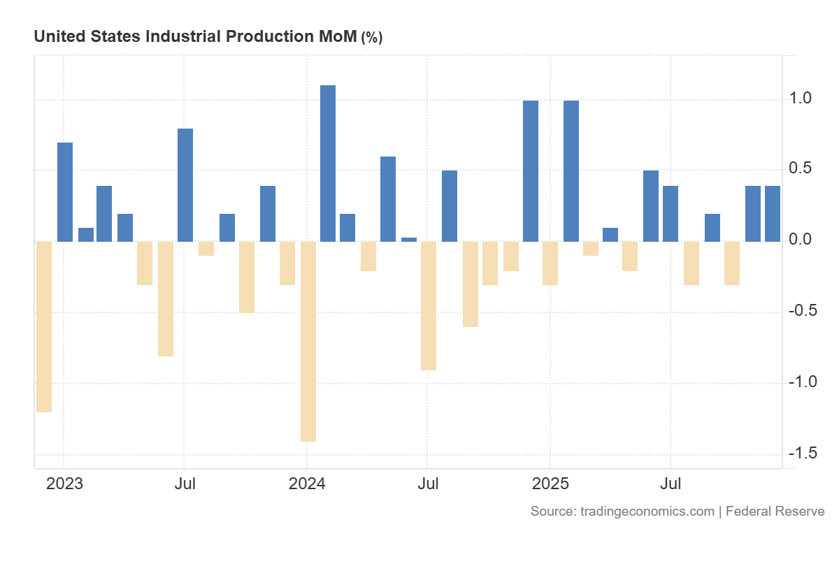 АҚШ-та өнеркәсіптік өндіріс айлық есеппен 0.4%-ға өсті, бұл +0.1% деңгейіндегі болжамнан айтарлықтай жоғары және алдыңғы көрсеткішпен (+0.4%) сәйкес келді. Бұл нәтиже нақты сектордағы серпіннің күтілгеннен де мықты екенін көрсетіп, өнеркәсіптік өндірістің төзімділігін растайды. АҚШ қор нарығы үшін бұл – конструктивті белгі, себебі ол экономиканың күрт баяулауына қатысты алаңдаушылықты азайтып, әсіресе өндіріс, тасымалдау және инвестициялық сұраныспен байланысты циклдік сегменттердегі табыс пен пайдаға деген күтулерді қолдайды. Маңыздысы – көрсеткіш алдыңғы аймен салыстырғанда жеделдеген жоқ, бұл нарықтардың деректерді экономиканың «қызып кетуінің» белгісі ретінде қабылдау тәуекелін төмендетеді.