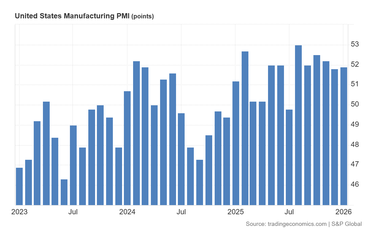 Өндірістік PMI индексі өңдеу өнеркәсібіндегі іскерлік белсенділіктің кеңеюде ме, әлде қысқаруда ма екенін көрсетеді. 50.0 деңгейінен жоғары мән өсімді, ал 50.0-ден төмен көрсеткіш қысқаруды білдіреді. Соңғы жарияланымда индикатор 51.9 деңгейінде қалыптасты, бұл 51.9 деңгейіндегі болжамға толық сәйкес келді және алдыңғы 51.8 мәнінен жоғары болды. Бұл өндірістік сектордың қалыпты өсім аймағында екенін, динамиканың аздап жақсарғанын, бірақ нарық үшін тосынсый болмағанын көрсетеді. АҚШ акциялар нарығы үшін мұндай нәтиже, әдетте, экономикалық циклдің тұрақтылығын растайтын белгі ретінде қабылданады: сұраныс пен өндірістік белсенділік әлсіреп жатқан жоқ, бұл компаниялардың табысы мен пайдасына қатысты күтулерді қолдайды.