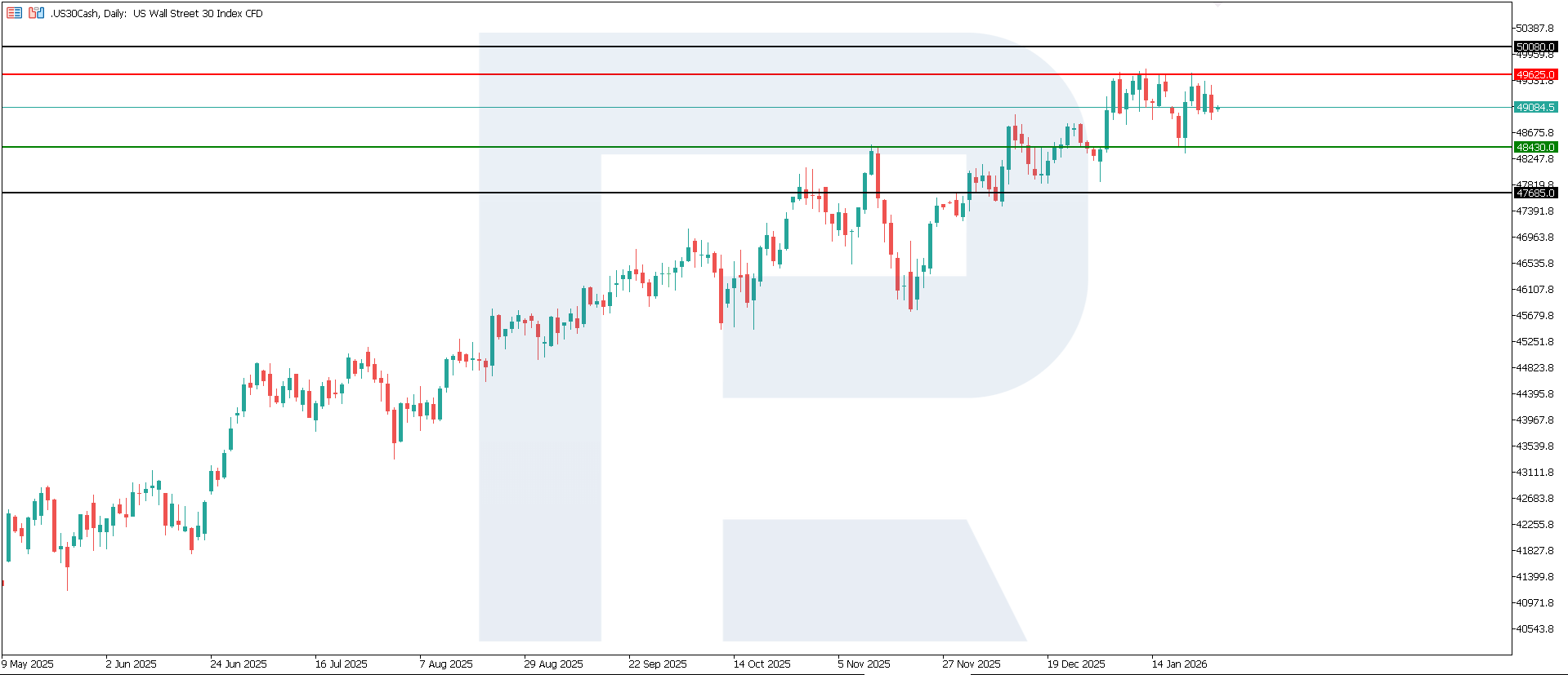 Соңғы өндірістік PMI деректері АҚШ өңдеу өнеркәсібінде қалыпты кеңею сақталып отырғанын растайды және жалпы алғанда АҚШ акциялары үшін бейтараптан сәл оң сигнал болып табылады. Алайда US 30 индексі үшін бұл тек әлсіз қолдаушы фактор ретінде көрінеді, себебі көрсеткіш нарықтық күтулерге толық сәйкес келді. Индекс үшін негізгі тренд төмендеу күйінде қалып отыр, ал ең жақын төменгі мақсат – 47,685.0 деңгейі.