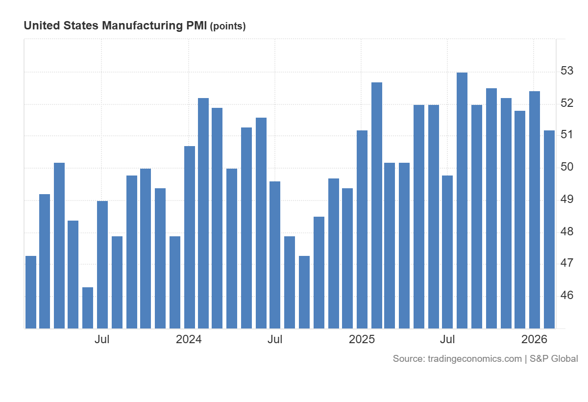 АҚШ-тың өндірістік PMI көрсеткішінің 51.2 пункт деңгейінде жариялануы (болжам — 52.4, алдыңғы мән — 52.4) қысқа мерзімді көңіл-күй үшін орташа теріс фактор болып табылады, себебі бұл өнеркәсіптік белсенділік өсімінің қарқыны баяулағанын көрсетеді. Алайда индикатор 50 пункттен жоғары деңгейде қалып отыр, яғни сектор формалды түрде әлі де кеңею аймағында. Мәселе қысқаруға ауысуда емес, серпіннің әлсіреуінде. Мұндай үйлесім нарық тарапынан өндірістік сегментте сұраныс пен тапсырыстар динамикасының сақтықпен бағалануы ретінде қабылданады.
