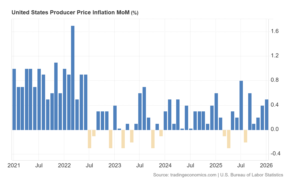 Болжамнан жоғары Өндірушілер бағасының индексі (PPI) әдетте нарық тарапынан өндіруші деңгейінде инфляциялық қысымның сақталып отырғанының сигналы ретінде қабылданады. Бұл баға өсімінің экономиканың басқа сегменттеріне де таралу ықтималдығын арттырады. Іс жүзінде инвесторлар ақша-несие саясатына қатысты күтулерін пайыздық мөлшерлемелердің ұзақ уақыт жоғары деңгейде сақталуы мүмкін деген бағытта қайта қарауы ықтимал. Қаржы нарықтарында бұл көбіне мемлекеттік облигациялар кірістілігінің өсуімен және АҚШ долларының нығаюымен қатар жүреді, ал мұндай жағдайда акциялар жоғары кірісті әрі тәуекелі төмен құралдармен салыстырғанда тартымдылығын жоғалтады.