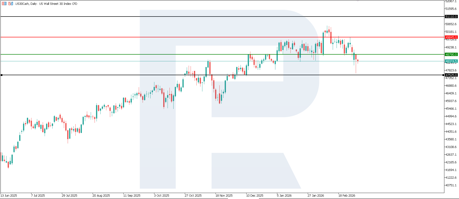 Болжамнан жоғары PPI деректері жақын перспективада АҚШ акциялар нарығының ұстамды динамика көрсету ықтималдығын арттырады. Мұндай жағдайда табысы тұрақты және шығындарын бақылауда ұстайтын компаниялар салыстырмалы түрде жақсы нәтиже көрсетуі мүмкін, ал қарыз алу құны мен пайыздық мөлшерлеме күтулеріне сезімтал секторлар әлсіздеу динамика көрсетуі ықтимал. Ең жақын төмендеу мақсаты — 47,525.0 деңгейі.
