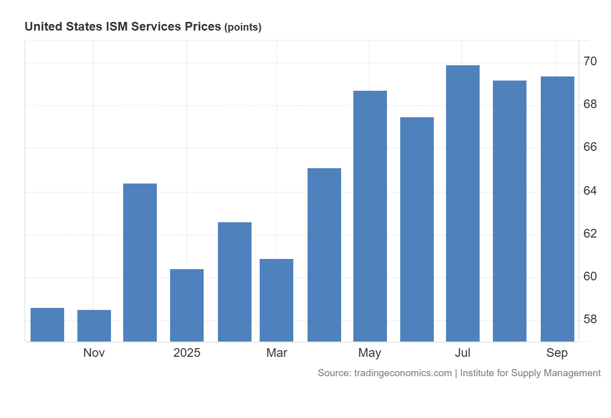 2025 жылдың қазан айына арналған ISM қызмет көрсету бағалары индексі 69.4 деңгейіне жетіп, болжанған 68.0-ден сәл жоғары және алдыңғы 69.2 мәнінен аздап жоғары болды. Қызмет көрсету секторындағы бағалардың өсуі АҚШ экономикасының негізгі сегменті саналатын осы салада инфляциялық қысымның сақталып тұрғанын білдіреді. Нарық қатысушылары үшін бұл өндірістік сектор баяулап жатқанына қарамастан, инфляциялық үрдістер тұрақты күйінде қалғанының белгісі. Мұндай жағдай Федералдық резервтің пайыздық мөлшерлемелерді бұрын болжанғаннан да ұзақ уақыт жоғары деңгейде ұстайтыны туралы күтулерді күшейтуі мүмкін. Соның салдарынан инвесторлар, әсіресе қарыз алу құнына сезімтал компанияларға қатысты, сақтық танытуда.