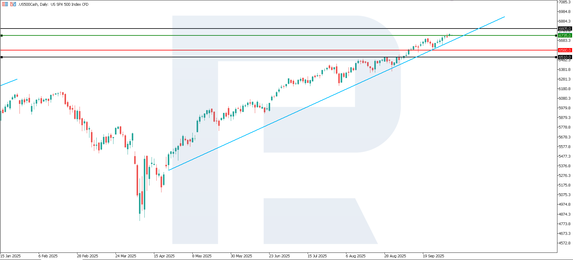 Күткеннен жоғары көрсеткіш қызмет көрсету секторындағы инфляциялық қысымның экономиканың басқа бөліктерінің баяулауына қарамастан сақталып тұрғанын білдіреді. Бұл қызмет көрсету бағаларының, еңбекақының және байланысты шығындардың өсуін жалғастыратынын, сондай-ақ ФРЖ-ны пайыздық мөлшерлемелерді ұзақ уақыт жоғары деңгейде ұстап тұруға итермелеуі мүмкін екенін көрсетеді. Техникалық тұрғыдан алғанда, US 500 индексі 6,805.0 деңгейіне дейін өсу траекториясын жалғастырады деп күтілуде.