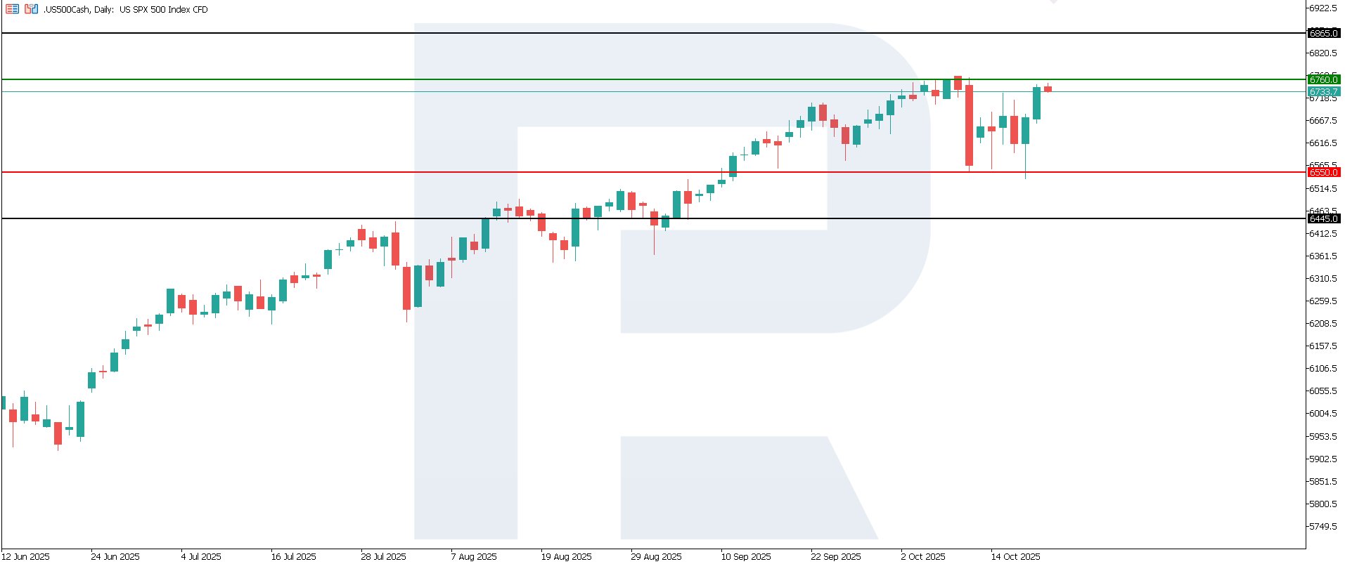 US 500 индексі үшін базалық сценарий құбылмалы, бірақ шектеулі өсу әлеуеті бар бүйірлік қозғалысты болжайды, мұнда нәтижелер көбіне компаниялардың табысы мен ақшалай ағындарына байланысты болады. Тұрақты өсу тренді ФРЖ өтімділікті қысқартуды баяулатқан немесе инфляцияның бәсеңдеуінің айқын белгілері пайда болған жағдайда ғана мүмкін болады. Егер shutdown-ның жақында аяқталуы туралы растаудан кейін инфляция мен жалақы бойынша оң деректер шықса, нарық көңіл-күйі жақсарып, индекс одан әрі өсуі ықтимал. Техникалық тұрғыдан, US 500 индексі 6,865.0 деңгейіне дейін көтерілуі мүмкін.