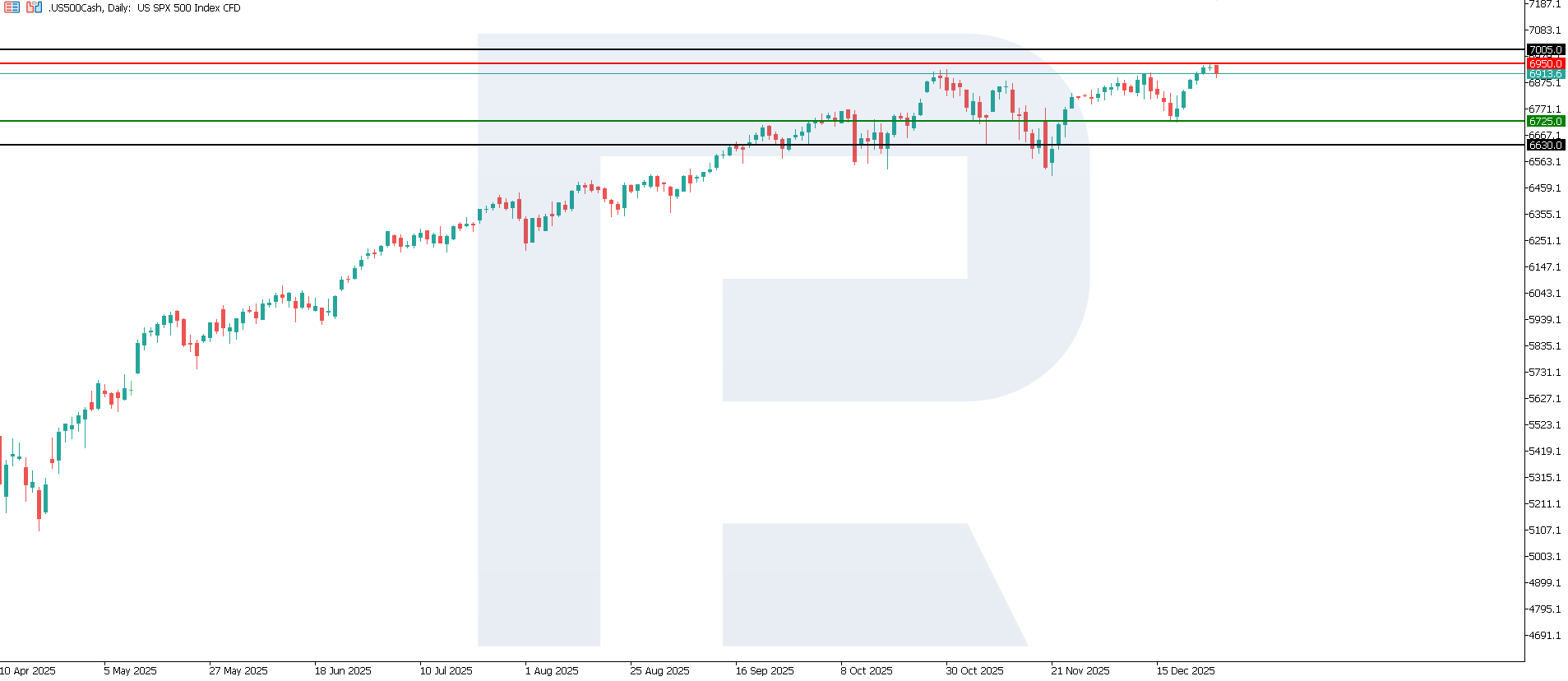 US 500 тарихи максимумын жаңартты және қазір түзету фазасында. 2025 жылғы 30 желтоқсан күніне арналған US 500 болжамы – оң.