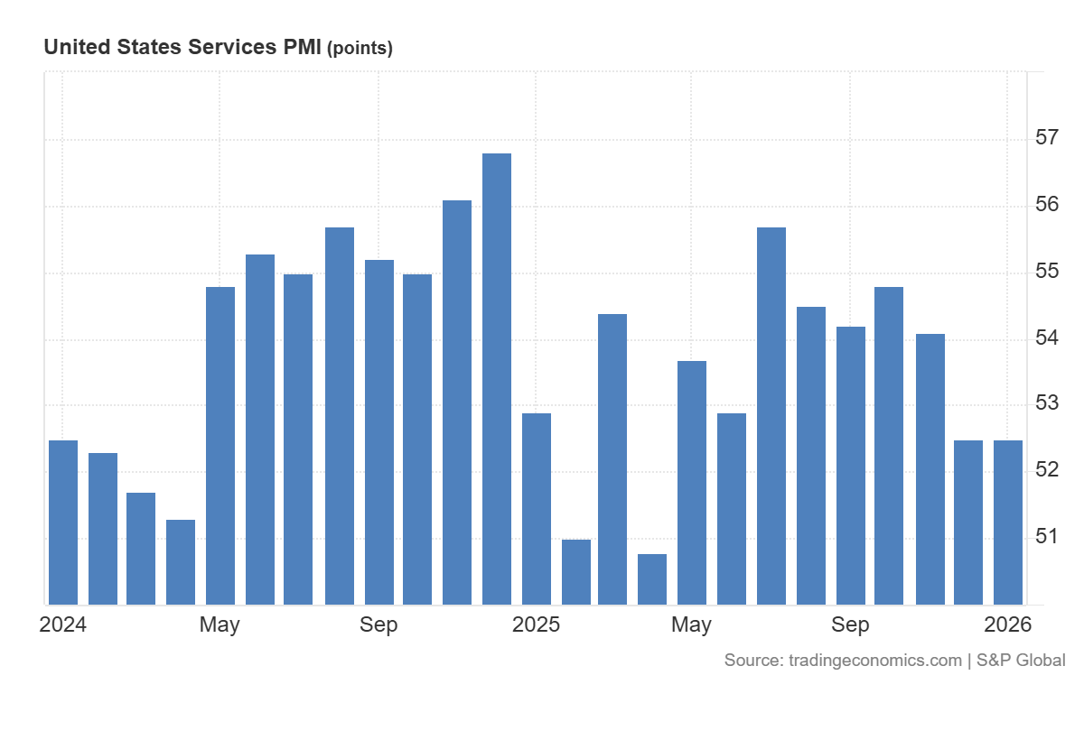 Қызмет көрсету секторының PMI индексі компаниялардың ағымдағы іскерлік жағдайларды, соның ішінде сұранысты, тапсырыс көлемін, жұмыспен қамтуды және жалпы белсенділік динамикасын қалай бағалайтынын көрсетеді. 50 деңгейі өсім мен қысқарудың шекарасын білдіреді, сондықтан 52.5 көрсеткіші АҚШ-тың қызмет көрсету секторы кеңеюді жалғастырып отырғанын аңғартады. Бұл акциялар нарығы үшін маңызды, себебі қызмет көрсету саласы АҚШ экономикасының едәуір бөлігін құрайды және жанама түрде көпшілік ашық компаниялардың табыс пен пайдаға қатысты күтулеріне, сондай-ақ пайыздық мөлшерлемелерге деген болжамдарға әсер етеді.