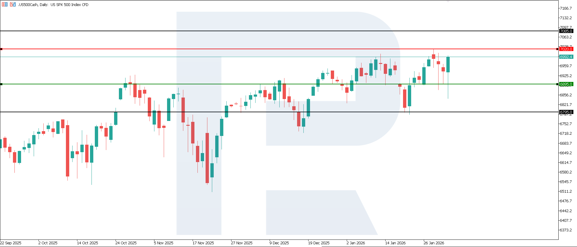 Пауэллдің пікірлерін ескере отырып, ФРЖ шешімі қаржылық жағдайларды қатаң деңгейде сақтауды, бірақ бірден қатаңдатпайтынын және мөлшерлемені жақын арада төмендетуге нақты сигнал бермейтінін растайды. АҚШ акциялар нарығы мен US 500 индексі үшін бұл қысқа мерзімді перспективада тәуекелдердің бейтарап-теріс теңгерімін және әрі қарайғы динамиканың инфляция деректеріне және облигациялар нарығының реакциясына тәуелділігінің артуын білдіреді. Техникалық тұрғыдан US 500 индексі 7,085.0 деңгейіне дейін өсуі мүмкін.