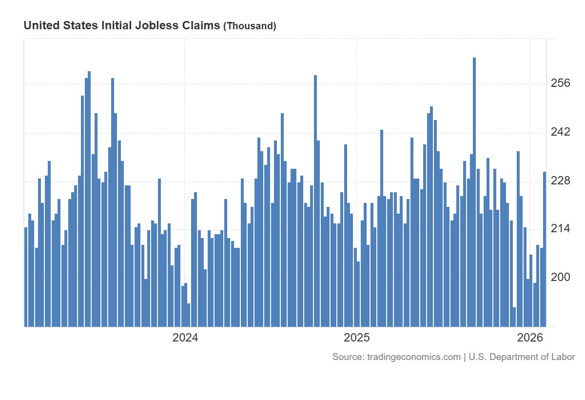 АҚШ-та бастапқы жұмыссыздық бойынша өтініштердің жариялануы (231 мың, болжам – 212 мың, ал алдыңғы аптада – 209 мың) US 500 индексі үшін қысқа мерзімді тұрғыда орташа теріс сигнал болып табылады, себебі бұл еңбек нарығының консенсус-күткеннен гөрі айқынырақ салқындауын көрсетеді. Сонымен қатар, ауқымын да ескеру маңызды: өтініштер деңгейі дағдарыстық мәндерден төмен және тарихи тұрғыдан қалыпты диапазонға жақын. Сондықтан бұл экономиканың күрт нашарлау белгісінен гөрі, біртіндеп баяулау сигналына көбірек ұқсайды.