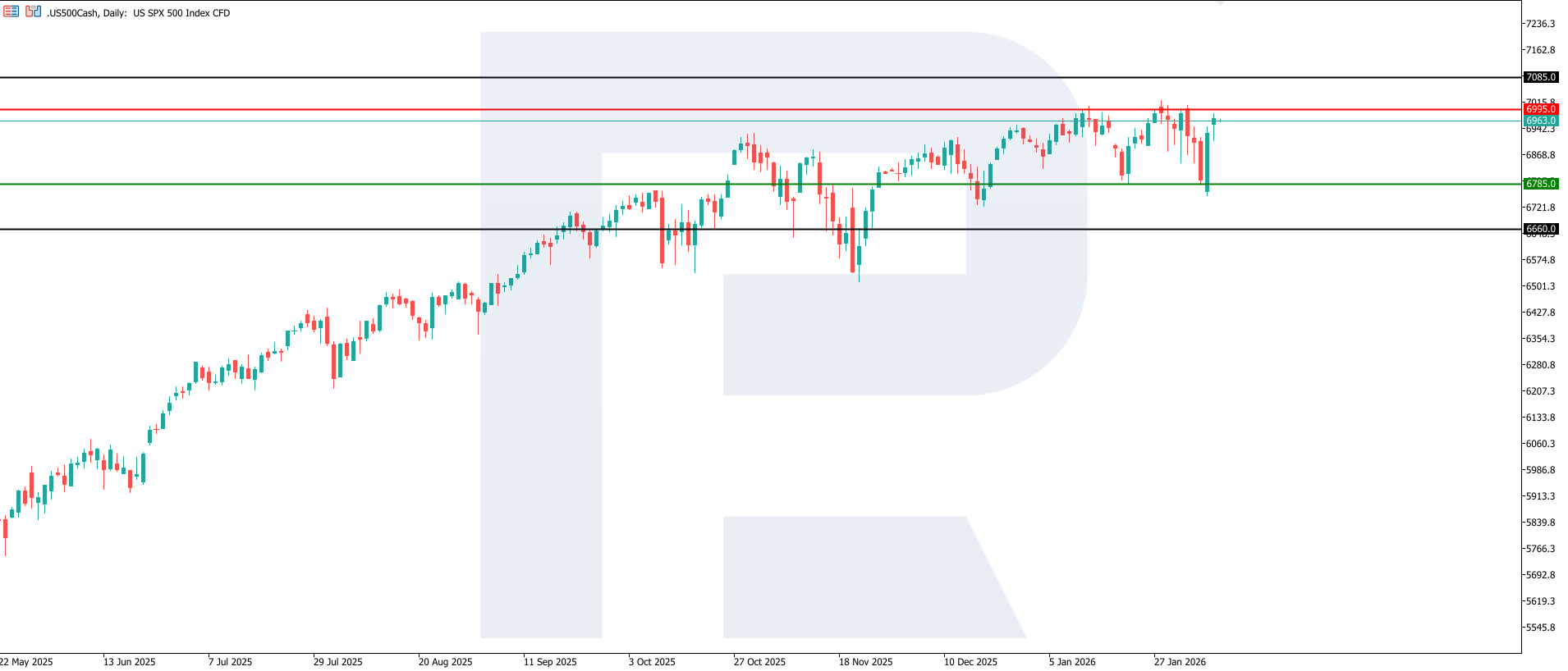 US 500 индексі үшін бұл статистика қысқа мерзімді құбылмалылықтың артуын және инвесторлардың мінез-құлқында секторлар бойынша айырмашылықтың күшеюін меңзейді. Еңбек нарығы мен инфляция бойынша алдағы деректер шешуші мәнге ие болады, өйткені олар анықталған импульстің тұрақтылығын растауы немесе жоққа шығаруы тиіс. Техникалық тұрғыдан алғанда, US 500 индексі 7,085.0 деңгейіне дейін өсуі мүмкін.