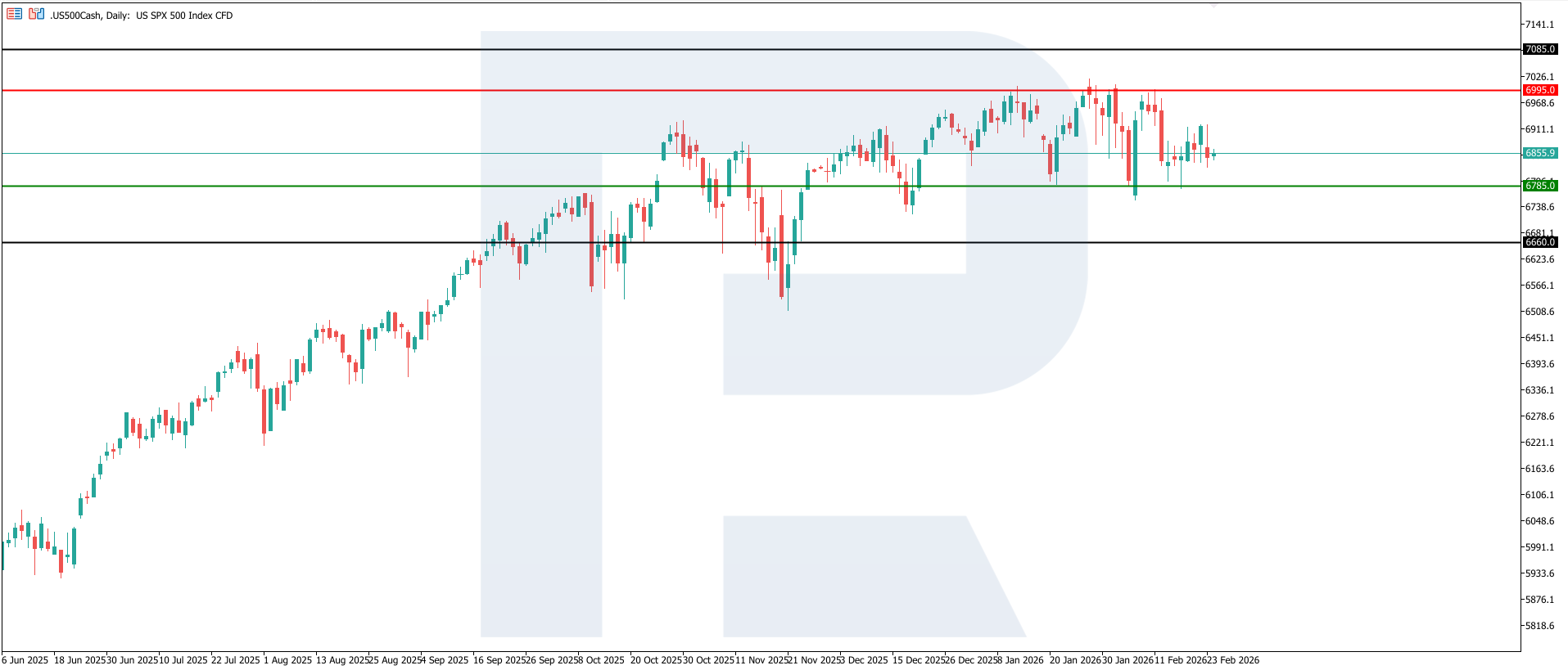 Әлсіз ЖІӨ деректері корпоративтік табысқа қатысты күтулер үшін қолайсыз сигнал болып табылады және индекс бойынша қысқа мерзімді төмендеу тәуекелін арттырады. Сонымен қатар, бұл қаржылық жағдайлардың жұмсаруы ықтималдығын күшейтіп, нарықты ішінара тұрақтандыруы және сұранысты жекелеген секторларға қайта бөлуі мүмкін. Мұндай жарияланымнан кейін базалық сценарий сақтық пен аралас динамиканы болжайды, мұнда компания сапасына назар артып, алдағы инфляция және еңбек нарығы деректеріне, сондай-ақ Федералдық резерв мәлімдемелеріне сезімталдық күшейеді. Техникалық тұрғыдан US 500 индексі 6,660.0 деңгейіне дейін төмендеуі мүмкін.