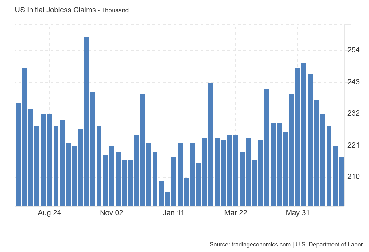 Алғашқы жұмыссыздық өтініштері 217 мыңды құрады, бұл сарапшылар күткен 227 мыңнан және алдыңғы 221 мыңнан төмен. Бұл еңбек нарығының тұрақтылығын көрсетеді, жұмыссыздық деңгейінің төмен екенін білдіреді. Мұндай көрсеткіштер экономикалық тұрақтылыққа және тұтынушылық шығындарға қолдау береді, бұл рецессия қаупін азайтады.