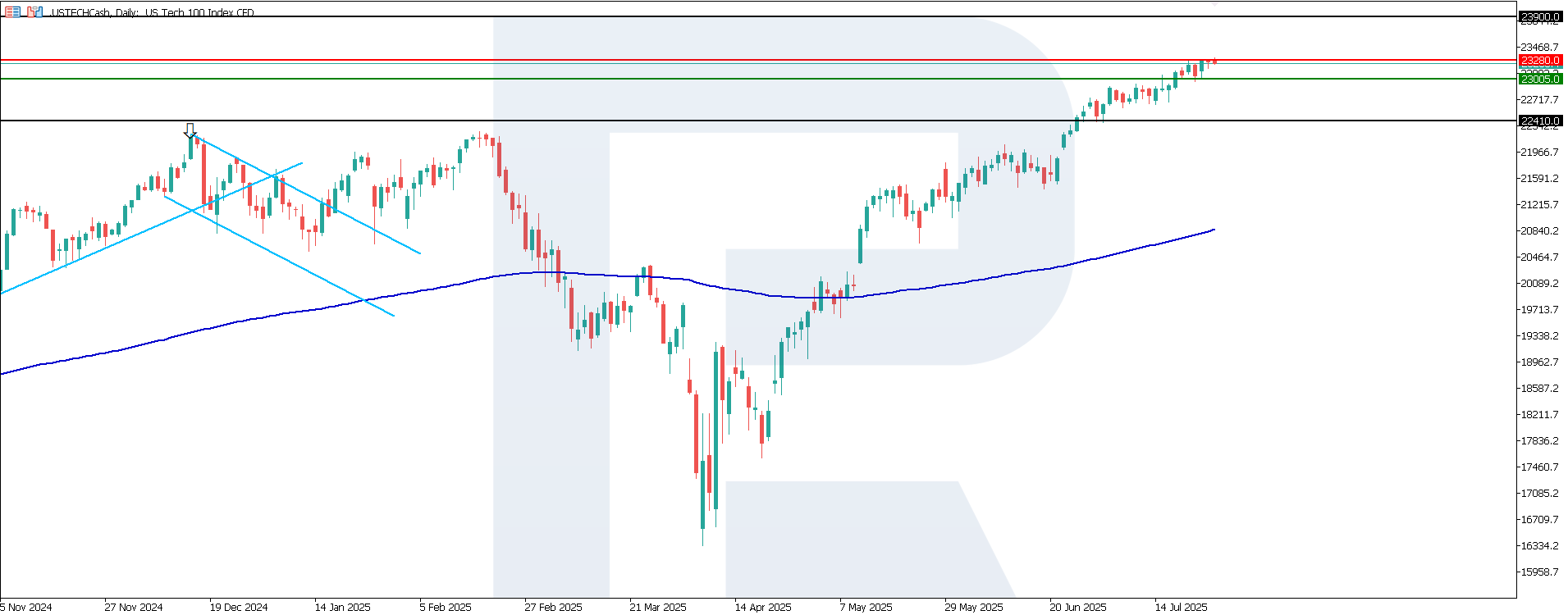US Tech индексі 22,900.0 деңгейіндегі алдыңғы қарсылықты бұзып өтіп, жаңа қарсылық деңгейін 23,280.0 аймағында қалыптастырды. Қолдау деңгейі 23,005.0-ге ауысты. Индекс тағы бір тарихи максимумға жетті, ал өсім 23,900.0 деңгейіне дейін жалғасуы мүмкін, одан кейін техникалық түзету басталуы ықтимал.