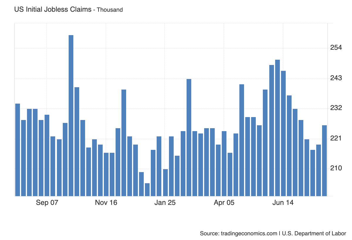 2025 жылғы 7 тамыздағы деректер бойынша, АҚШ-та алғашқы жұмыссыздыққа өтініштер саны 226 мың болды. Бұл болжамдағы 221 мыңнан және алдыңғы 219 мыңнан жоғары. Жұмыссыздыққа өтініштердің өсуі әдетте экономикалық баяулаудың және корпоративтік табыстарға төнетін қауіптердің белгісі ретінде қабылданады, сондықтан қор нарығы теріс реакция беруі ықтимал. Қаржы және өнеркәсіп секторлары ең көп зардап шегуі мүмкін.