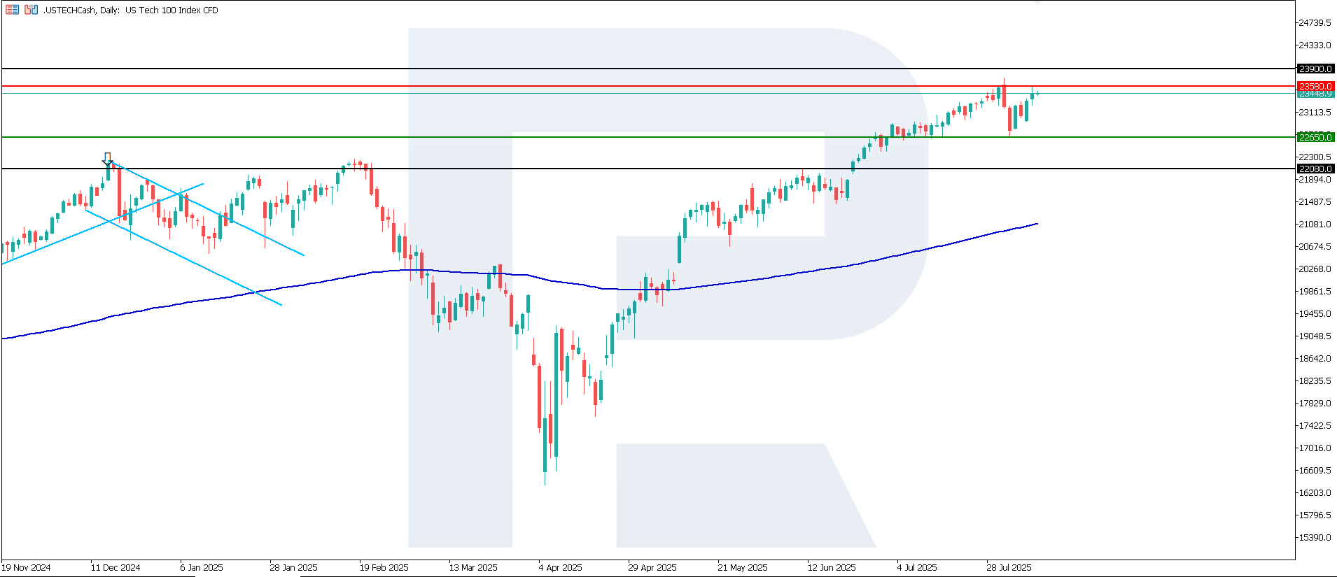 2025 жылғы 8 тамыз күнгі US Tech техникалық талдауыUS Tech индексі алдыңғы 23,260.0 қолдау деңгейінен төмен түсіп, жаңа қарсылықты 23,580.0, ал ең жақын қолдауды шамамен 22,650.0 деңгейінде қалыптастырды. Индекс түзетуші төмендеу арнасының ішінде қозғалып жатыр, бұл қысқа мерзімді сипатта болуы ықтимал, ал ең жақын төмендеу мақсаты – 22,905.0.