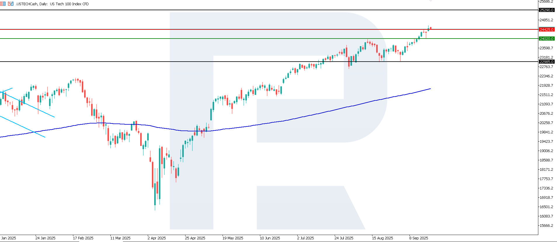 АҚШ акциялар нарығы Федералдық резервтен нақты қолдау сигналы алды. Дегенмен, ұзақ мерзімді инфляция траекториясы мен тарифтік саясатқа қатысты белгісіздік US Tech раллиінің қалыпты және құбылмалы болуын білдіреді. Инвесторлар назарын күшті балансы бар және шығындарды соңғы тұтынушыларға аудара алатын компанияларға ауыстыруда. US Tech үшін келесі өсу мақсаты 25,290.0 болуы мүмкін.
