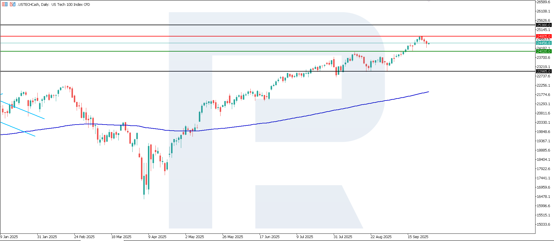 2025 жылғы 26 қыркүйек күнгі US Tech техникалық талдауыUS Tech бұрынғы 24,425.0 деңгейіндегі қарсылықты еңсерді, ал жаңа қолдау аймағы 24,020.0 деңгейінде қалыптасты. Жаңа қарсылық 24,805.0 деңгейінде пайда болды. Восходящий трендтің орта мерзімді сипаты жоғары ықтимал. Жақын өсім мақсаты ретінде 25,380.0 деңгейін қарастыруға болады.