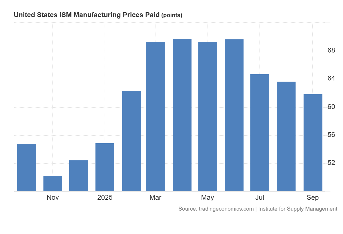 АҚШ-тың ISM өндірістік бағалар индексі қазанда 61.9 деңгейінде болып, болжамдағы 62.7-ден төмен және алдыңғы 63.7 көрсеткішінен айтарлықтай төмен болды. Төмен нәтиже өнеркәсіп секторындағы баға өсімінің баяулауын білдіреді. Инвесторлар үшін бұл өндірушілер тарапынан болатын инфляциялық қысым әлсіреуде деген белгі. Мұндай нәтиже әдетте қор нарығы үшін оң болып саналады, себебі ФРЖ-ның күтуден де агрессивті ақша-несие саясатын қатаңдатуына деген ықтималдық азаяды. Қысқа мерзімде бұл АҚШ акцияларының өсуін қолдауы мүмкін.