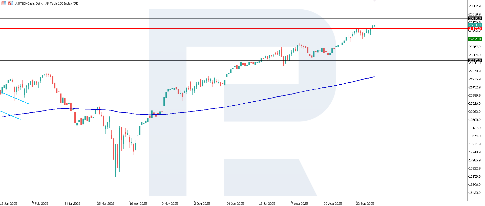 2025 жылғы 3 қазан күнгі US Tech техникалық талдауыUS Tech индексі алдыңғы 24,805.0 қарсылық деңгейінен жоғары серпіліп, 24,195.0 маңында жаңа қолдау сызығын қалыптастырды. Жаңа қарсылық деңгейі әлі қалыптасқан жоқ. Өсу үрдісі орта мерзімді болуы ықтимал, ең жақын өсу мақсаты – 25,380.0.