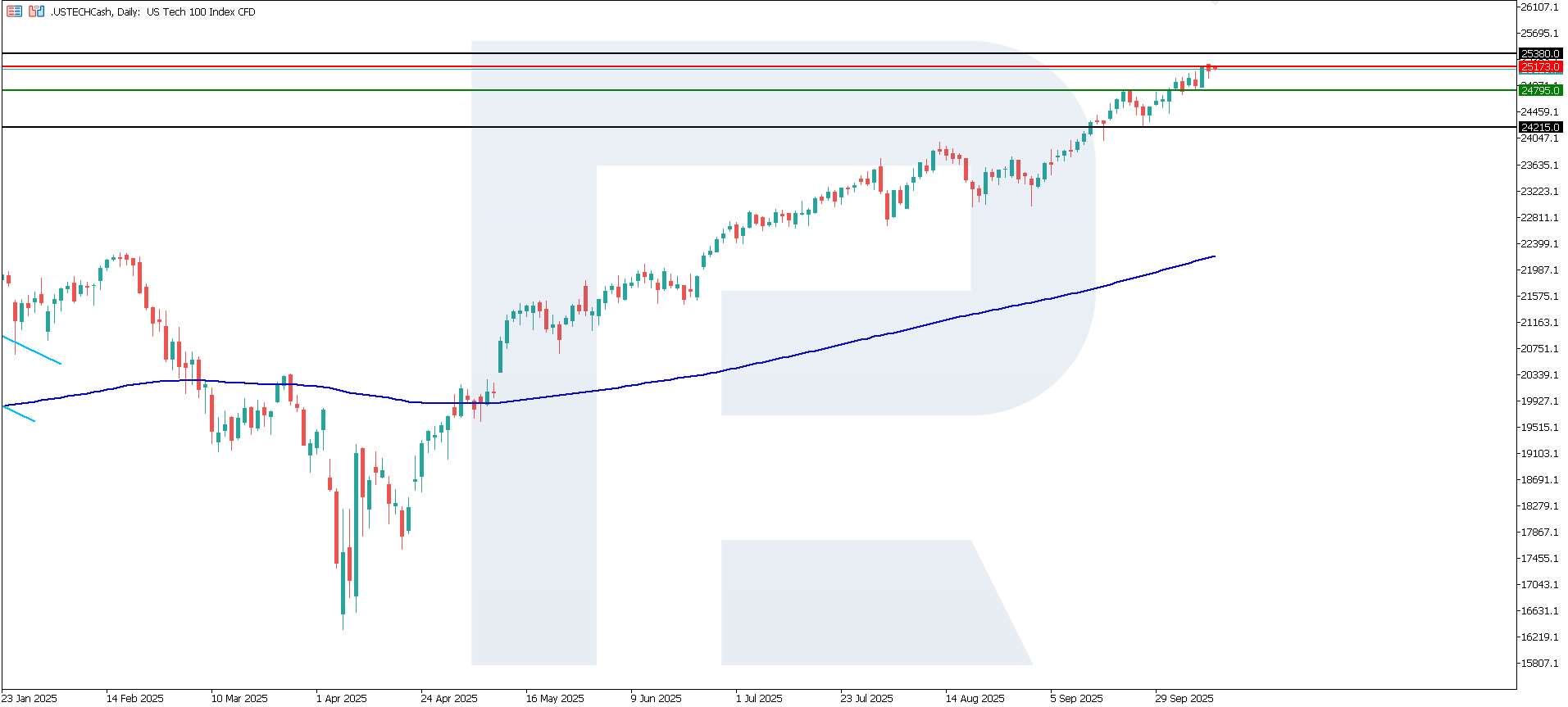 2025 жылғы 10 қазан күнгі US Tech техникалық талдауыUS Tech индексі жаңа тарихи максимумға жетіп, 25,173.0 деңгейінде қарсылық және 24,795.0 деңгейінде жаңа қолдау аймағын қалыптастырды. Өсу үрдісі орта мерзімді сипатта болып қала береді, ал келесі жоғары мақсатты деңгей 25,380.0 болуы ықтимал.