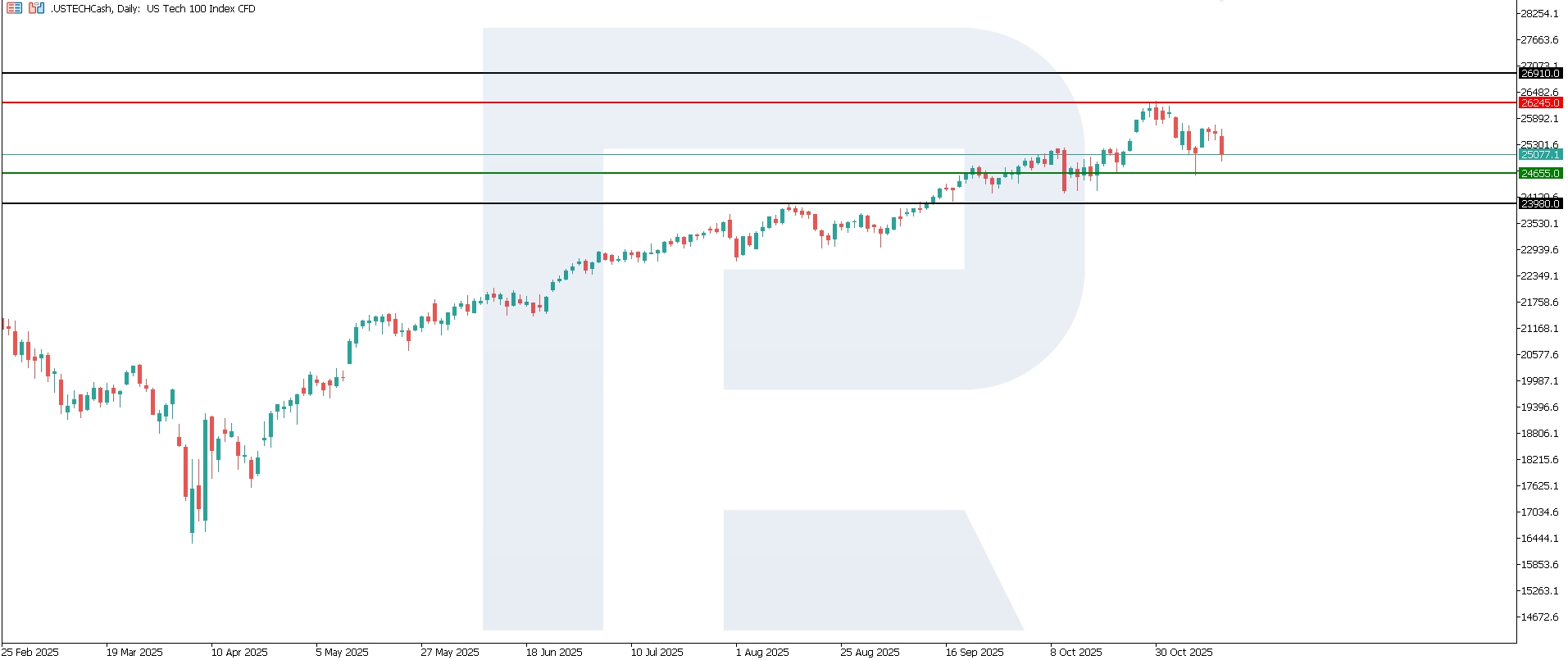 Технологиялық сектордағы кірістер мен сұраныстың күтілетін өсуі мөлшерлемелердің жоғары немесе ұзақ сақталуынан болатын қысымды ішінара өтей алады. Орта мерзімді перспективада US Tech индексінің бағыты инвесторлар үшін қай фактордың маңыздырақ болатынына байланысты: технологиялық компаниялардың тұрақты бизнес өсімі ме, әлде қарыз алу құнының ұзақ жоғары болуы мен облигация кірістілігінің әсері ме. Техникалық тұрғыдан алғанда, US Tech индексінің келесі өсу мақсаты 26,910.0 деңгейі болуы мүмкін.