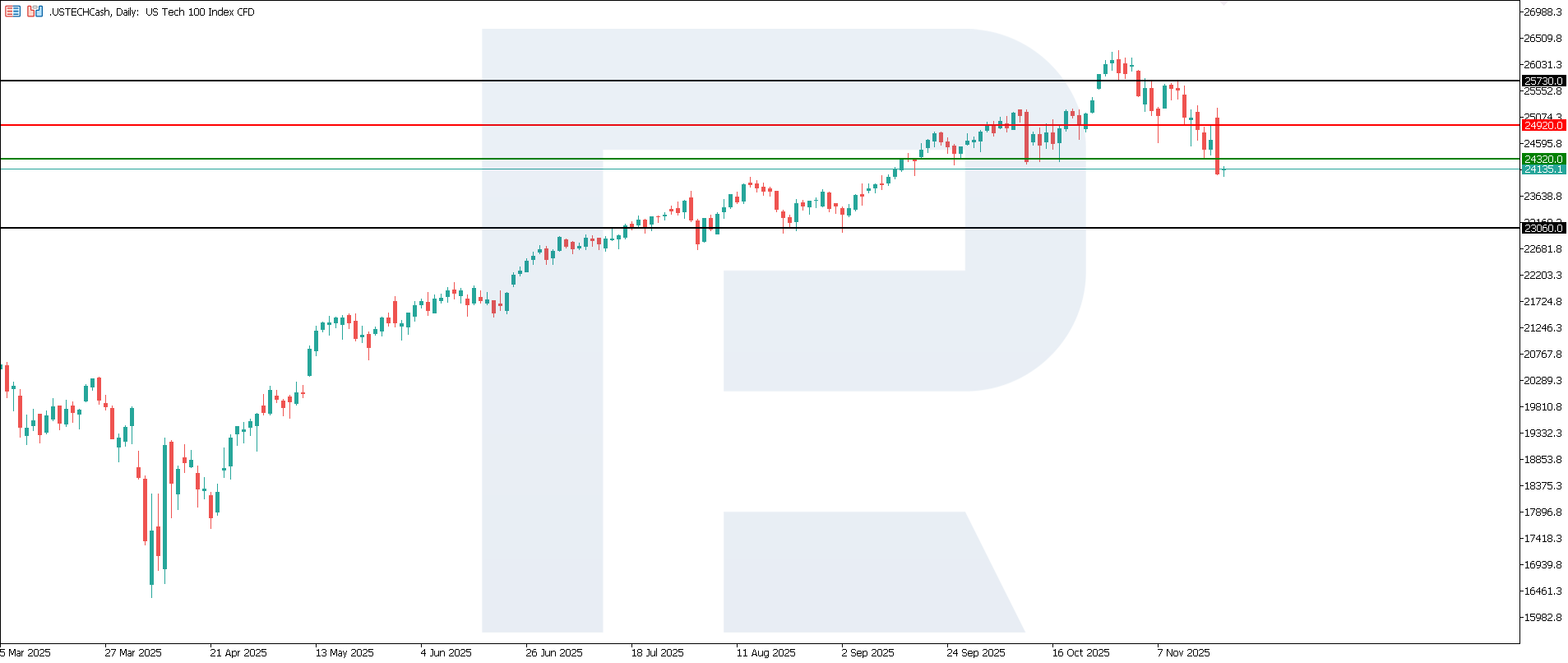 2025 жылғы 21 қараша күнгі US Tech техникалық талдауыUS Tech индексі айқын төмендейтін трендке енді, тарихи максимумынан 8%-дан астам арзандады. Ең жақын қарсылық деңгейі – 24,920.0. 24,655.0 қолдау деңгейі бұзылды, ал жаңасы әлі қалыптасқан жоқ. Келесі төменгі мақсат – 23,060.0.