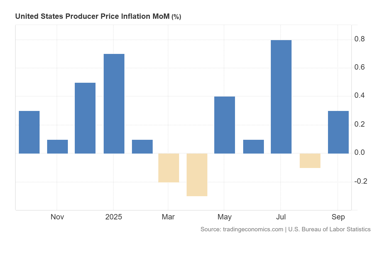 Жарияланған АҚШ-тың айлық өндіруші бағалар индексі (PPI) 0.3% өсім көрсетті. Бұл болжамға дәл сәйкес келді, бірақ өткен айдағы -0.1% көрсеткіштен айтарлықтай ерекшеленеді, ол кезде көтерме бағалар төмендеген еді. Бұл бизнеске түсетін шығындық қысымның қайта өсіп жатқанын білдіреді. Өндірушілер шикізат, компоненттер және қызметтер үшін көбірек төлей бастады. Уақыт өте келе бұл шығындардың бір бөлігі түпкілікті тұтынушыларға берілуі мүмкін, сөйтіп инфляцияға ықпал етеді.