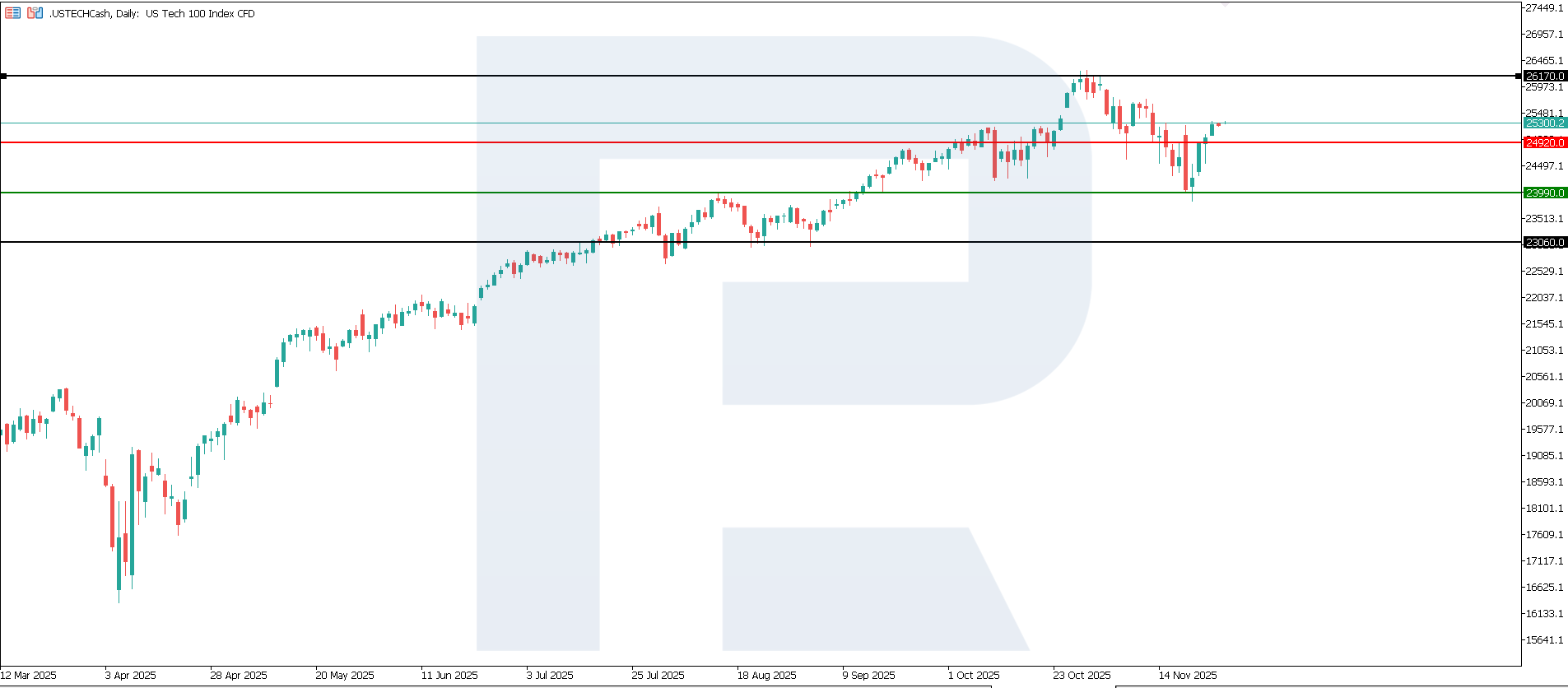 2025 жылғы 28 қараша күнгі US Tech техникалық талдауыUS Tech индексі төмендеу арнасын бұзып, өсімді қайта бастады. 24,920.0 деңгейіндегі жақын қарсылық жойылды, ал қолдау 23,990.0 деңгейіне ауысты. Келесі өсу мақсаты — 26,170.0.
