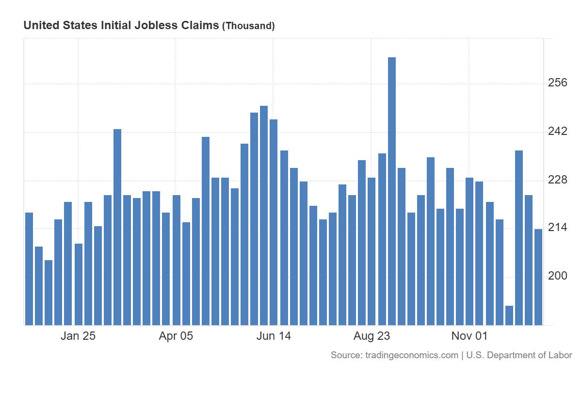 Initial Jobless Claims көрсеткіші өткен аптада алғаш рет жұмыссыздық бойынша жәрдемақыға өтініш берген адамдар санын өлшейді. Бұл еңбек нарығының ең жедел индикаторларының бірі: көрсеткіш неғұрлым төмен болса, жұмыспен қамту соғұрлым тұрақты, ал экономиканың әлсіреу белгілері аз болады. Соңғы мән 214 мыңды құрады, бұл болжамдағы 224 мыңнан және алдыңғы көрсеткіштен (224 мың) төмен. Басқаша айтқанда, дерек күтілгеннен жақсы шықты және өткен аптамен салыстырғанда төмендеді. Бұл еңбек нарығының төзімді екенін көрсетеді: компаниялар жаппай қысқартуларды жеделдетіп жатқан жоқ, ал тұтынушылық сұраныс тұрақты табыстар есебінен қолдау табуда.