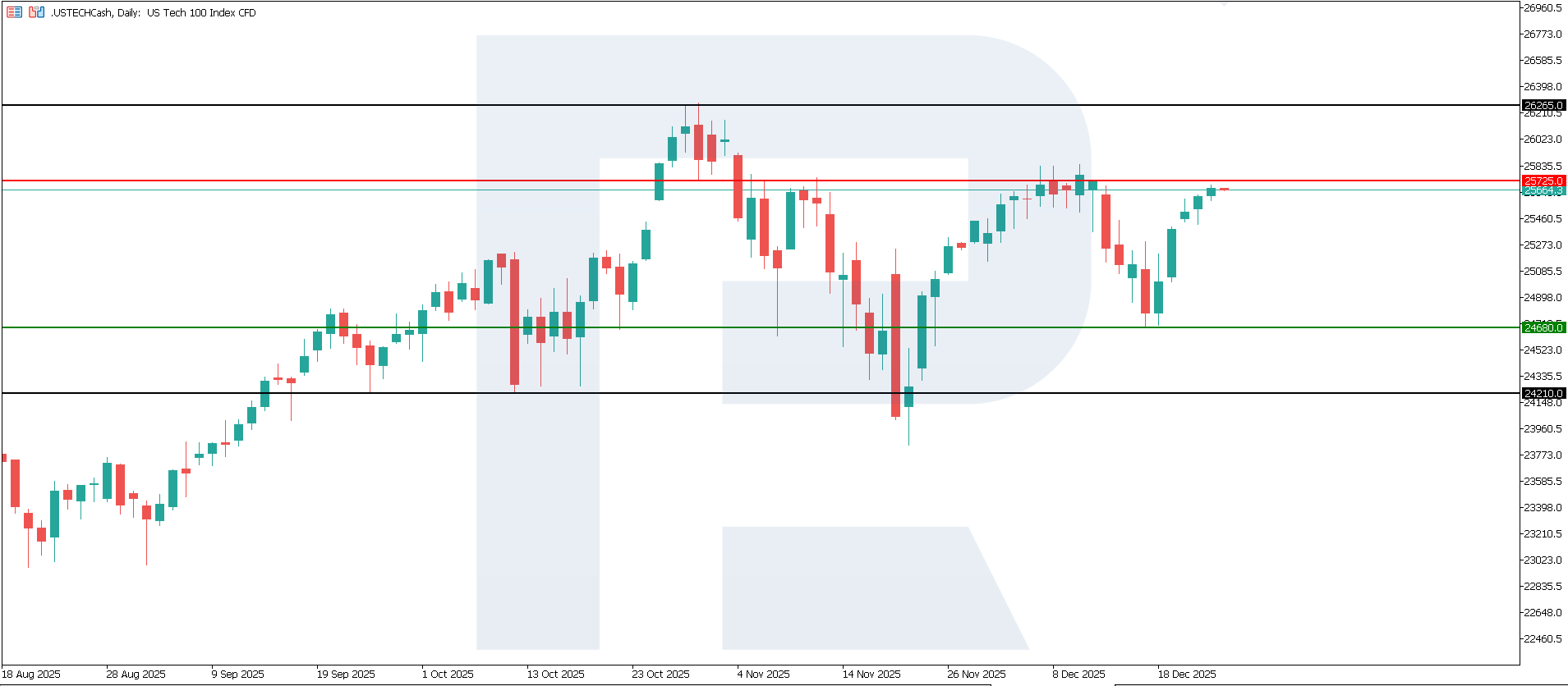 2025 жылғы 26 желтоқсан күнгі US Tech техникалық талдауыUS Tech индексі әлі де төмендеу үрдісінде қалып отыр. Ең жақын қарсылық деңгейі 25,725.0, ал қолдау деңгейі 24,680.0 аймағына ауысты. Дегенмен, баға қарсылыққа қарай өсіп келеді және оны бұзу ықтималдығы жоғары. Егер қарсылық деңгейі бұзылса, үрдіс қайтадан жоғары бағытқа ауысуы мүмкін. Өсу мақсаты — 26,265.0.