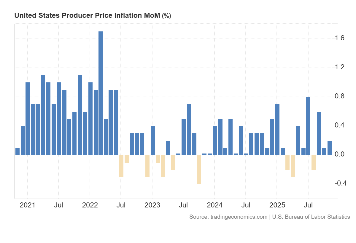 АҚШ-тың Өндіруші бағалар индексі (PPI) айлық есепте 0.2%-ға өсіп, нарық күтілімдеріне толық сәйкес келді және алдыңғы +0.6% көрсеткішпен салыстырғанда айтарлықтай баяулады. Акциялар нарығы үшін мұндай динамика, әдетте, орташа қолайлы ретінде қабылданады, өйткені PPI жеткізу тізбектеріндегі баға қысымының ерте индикаторы болып табылады, ал оның баяулауы алдағы айларда тұтыну инфляциясының жеделдеу тәуекелін төмендетеді. Нәтижесінде, Федералдық резервтің қатаң монетарлық жағдайларды ұзақ уақыт сақтауы қажеттілігі азаяды.