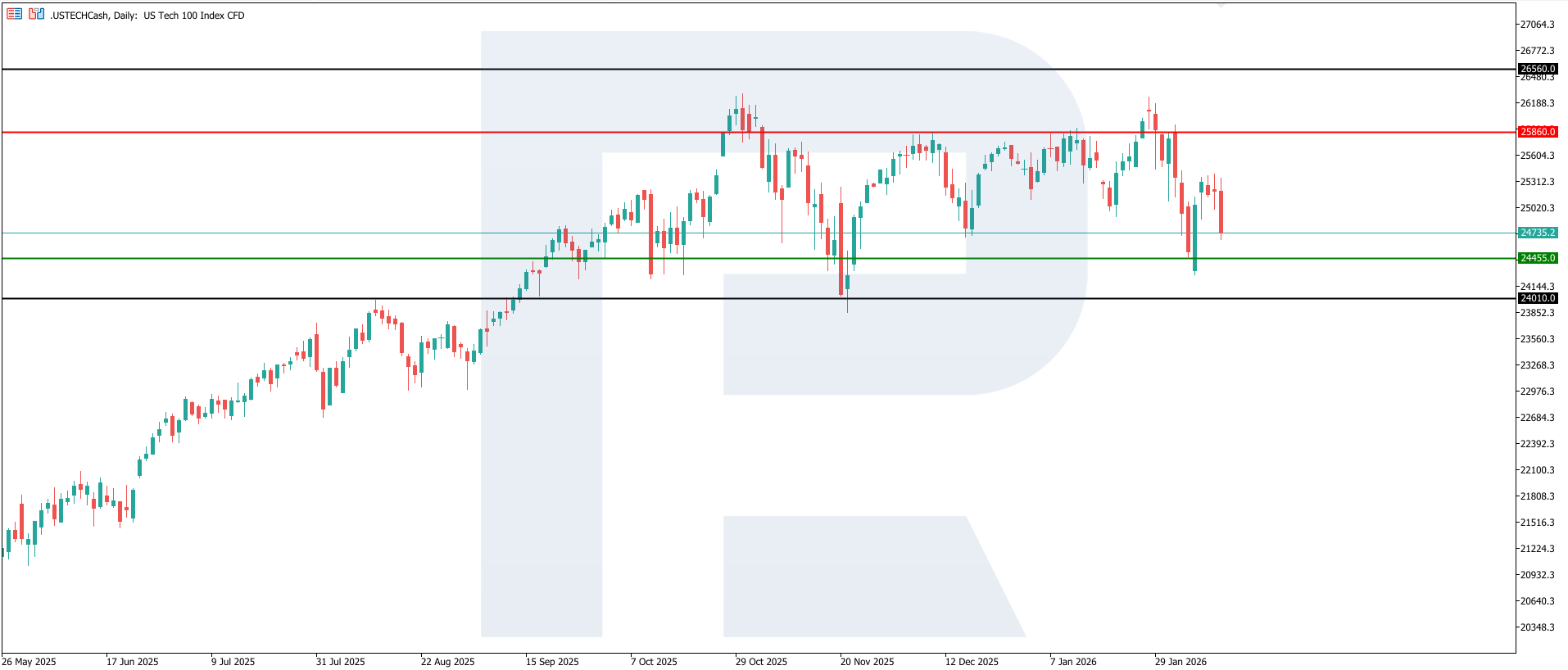 130 мың жаңа жұмыс орнының құрылуы және жұмыссыздықтың 4.3%-ға дейін төмендеуі АҚШ экономикасының тұрақтылығын растайтын базалық сценарийді қолдайды және жалпы алғанда акциялар, соның ішінде US Tech үшін оң фактор болып табылады. Алайда бұл пайыздық мөлшерлемелер динамикасына байланысты құбылмалылықтың арту тәуекелін толық жоймайды. Қысқа мерзімді перспективада шешуші фактор – инфляция, жалақы және жұмыспен қамту жөніндегі алдағы деректердің қызып кетусіз жұмсақ баяулауды растауы. Бұл жағдайда тәуекелді активтердің әрі қарай өсуіне неғұрлым қолайлы жағдай қалыптасады. Ең жақын төмендеу мақсаты 24,010.0 деңгейі болуы мүмкін.