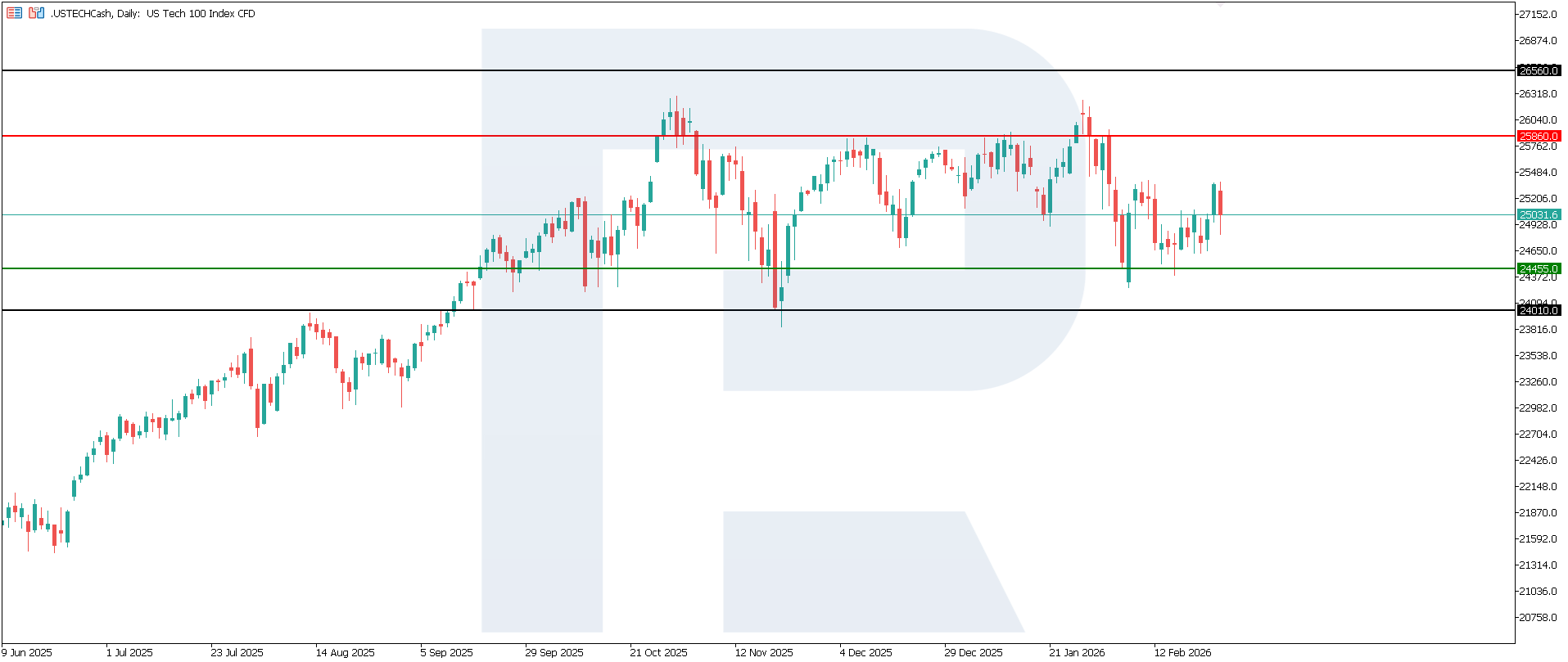 Қызмет көрсету PMI деректері қысқа мерзімді экономикалық серпінді бағалауды орташа деңгейде нашарлатады, бірақ күрт баяулау сценарийін растамайды. US Tech үшін бұл пайыздық мөлшерлемелер траекториясына және корпоративтік табыс сапасына тәуелділіктің сақталуын білдіреді. Егер облигациялар кірістілігі төмендесе, әлсіз PMI деректерінің теріс әсері ішінара өтелуі мүмкін. Алайда табыс пен инвестициялық бюджеттерге қатысты күтулер нашарлаған жағдайда, технологиялық акцияларға деген сұраныс таңдамалы болып қала береді. Ең жақын төмендеу мақсаты — 24,010.0 деңгейі.