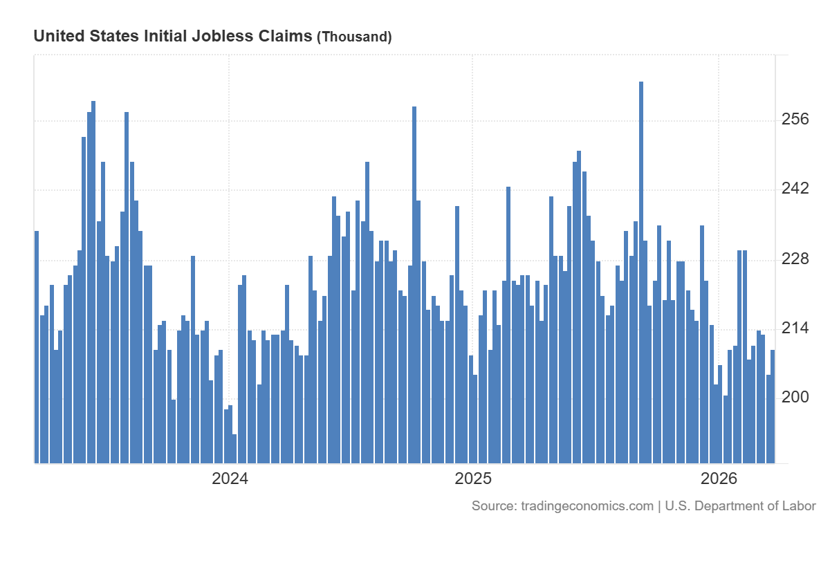 АҚШ-тың алғашқы жұмыссыздық бойынша өтініштері жөніндегі деректер жалпы алғанда АҚШ экономикасы үшін орташа күшті сигнал болып көрінеді. Нақты көрсеткіш 210 мың болды, бұл 211 мың болжамынан төмен, яғни нәтиже күтілгеннен сәл жақсырақ шықты. Сонымен қатар алдыңғы 205 мың көрсеткішпен салыстырғанда бұл шамалы өсімді білдіреді. Мұндай үйлесім әдетте еңбек нарығы күрт нашарлау белгілерінсіз тұрақты күйде қалып отырғанын білдіреді. Акциялар нарығы үшін бұл АҚШ экономикасының әлі де салыстырмалы түрде тұрақты жағдайда екенін көрсетеді, бірақ сонымен бірге ақша-несие саясатын жедел жұмсарту ықтималдығын азайтады.