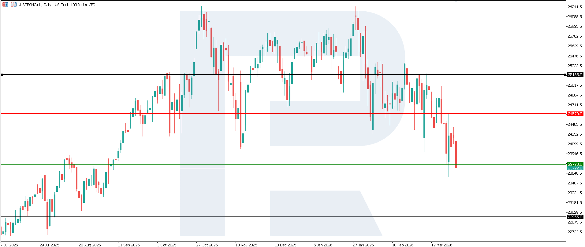 2026 жылғы 27 наурыз күнгі US Tech техникалық талдауыUS Tech индексі төмендеу импульсін көрсетіп отыр. Ең жақын қарсылық деңгейі шамамен 24,570.0 маңында орналасқан, ал негізгі қолдау деңгейі 23,780.0 аймағында жатыр. Қазіргі уақытта баға қолдау деңгейінен төмен консолидацияланып тұр. Егер қысым сақталса, келесі төмендеу мақсаты 22,955.0 аймағы болуы мүмкін.
