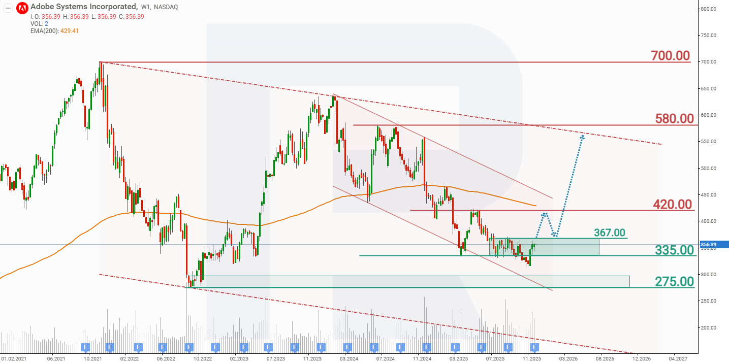 Adobe акцияларының ағымдағы динамикасына сүйенсек, Adobe акциялары үшін болжам 367 USD деңгейіндегі қарсылықтан жоғары бұзылуды, кейін 420 USD бағытына жоғары қозғалысты меңзейді. Егер 420 USD қарсылығы бұзылса, ADBE акциялары 550 USD аймағындағы төмендеуші тренд сызығына қарай ілгерілеуі мүмкін. Компанияның күшті қаржылық жағдайын және келесі тоқсанға берік болжамын ескерсек, бұл сценарийдің 2026 жылы жүзеге асу ықтималдығы жоғары болып көрінеді.