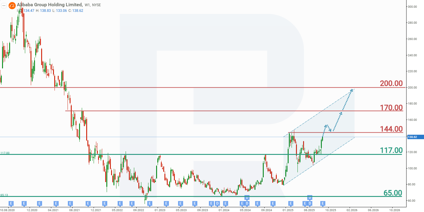 Апталық графикте Alibaba акциялары өсуші арна ішінде саудалануда. 2025 жылғы қыркүйек айының соңында баға шамамен 193 АҚШ доллары маңындағы жергілікті максимумға жетіп, қазіргі уақытта жалғасып жатқан түзетуге кірді. Дегенмен, бұл түзету барысында графикте Flag (Жалау) моделі қалыптасты, ол өсу трендінің қайта жалғасу ықтималдығын көрсетеді. Alibaba Group Holding Limited акцияларының ағымдағы динамикасына сүйене отырып, 2026 жылға арналған ықтимал баға сценарийлері төмендегідей: