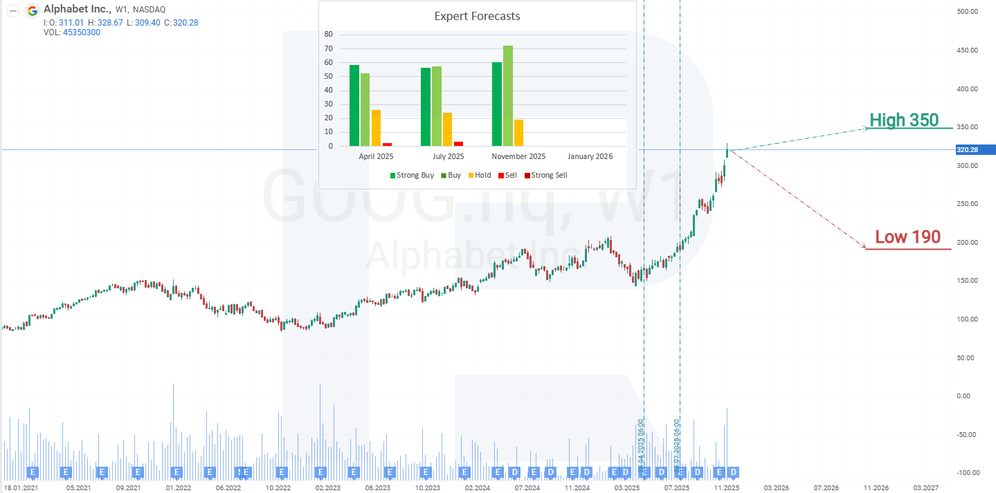 Апталық графикте Alphabet акциялары өсіп келе жатқан арнасының жоғарғы шекарасын бұзып өтіп, 300 АҚШ доллары деңгейінен жоғары бірікті. Мұндай жағдайларда баға әдетте бұзылған арнаның биіктігіне тең шамада өсуін жалғастырады, бұл GOOG акцияларының әрі қарай өсім әлеуетін білдіреді. Дегенмен соңғы үш аптада акция бағасы айтарлықтай түзетусіз тез өсті, сондықтан келесі өрлеу толқыны басталғанға дейін қысқа мерзімді кері шегіну ықтималдығы сақталады. Alphabet Inc. акцияларының қазіргі динамикасына сүйене отырып, 2025 жылға арналған ықтимал сценарийлер төмендегідей: