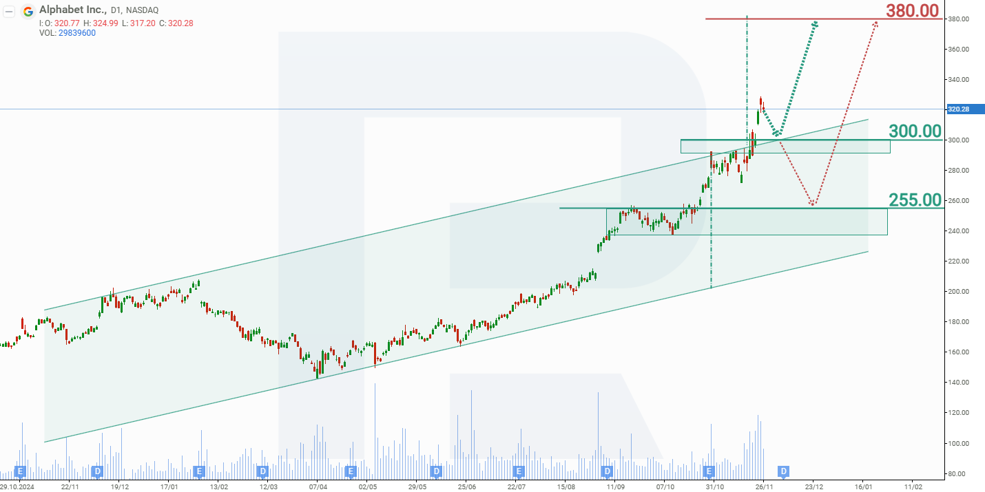 Базалық сценарий бойынша Alphabet акциялары алдымен 300 АҚШ доллары деңгейіндегі қолдауды ретест жасап, содан кейін серпіліп, 380 АҚШ доллары деңгейіндегі қарсылыққа дейін өсуі мүмкін.
