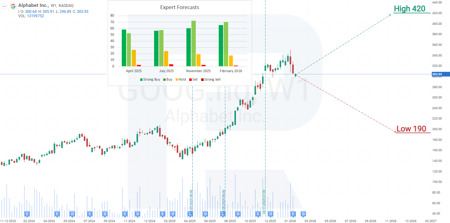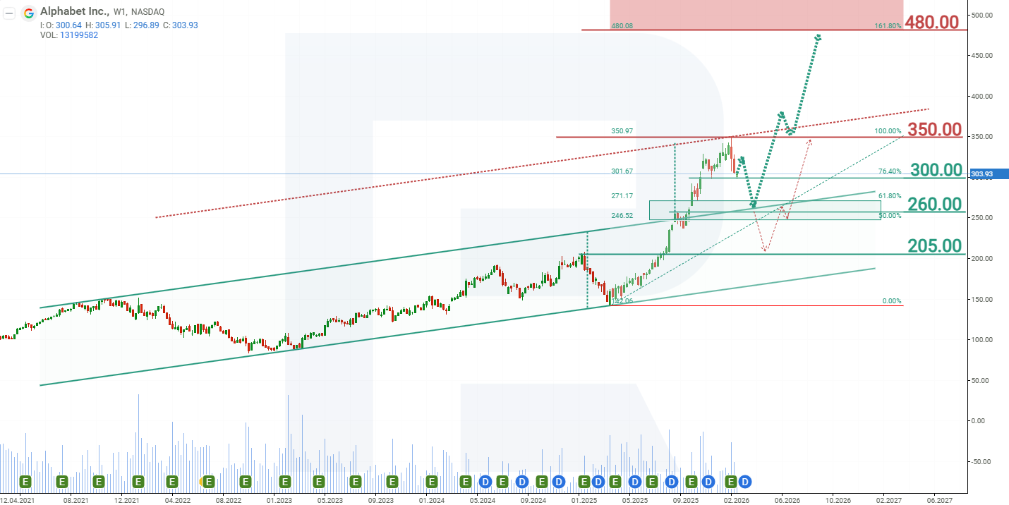Alphabet акциясына арналған базалық сценарий болжамы бойынша, акциялар 260 АҚШ доллары қолдау деңгейіне қарай әрі қарай төмендеуі ықтимал, сол жерде түзету аяқталып, ұзақ мерзімді өрлейтін тренд қайта жалғасуы тиіс. Қалпына келудің алғашқы мақсаты — тарихи максимум, шамамен 350 АҚШ доллары. Егер бұл деңгей бұзылса, келесі мақсат Fibonacci деңгейлері арқылы есептелген 480 АҚШ доллары болуы мүмкін.
