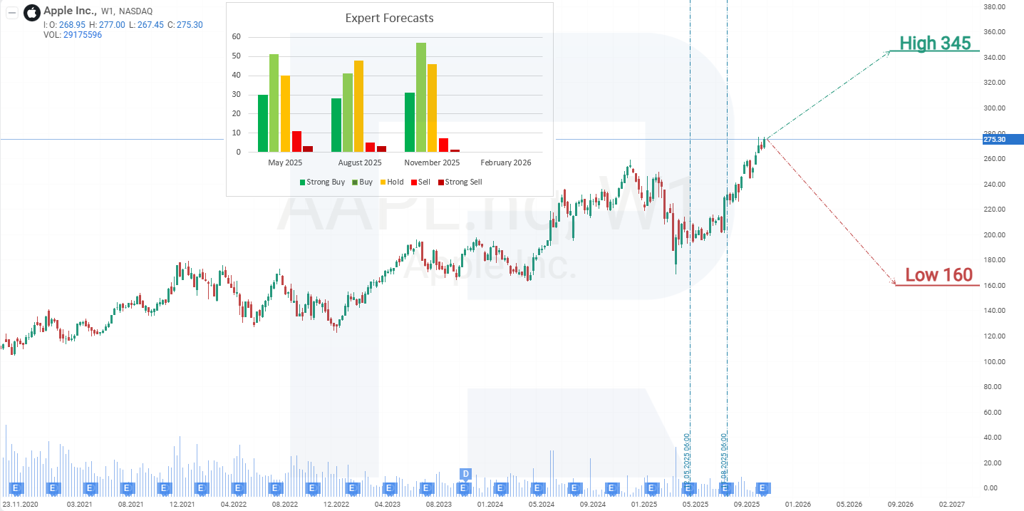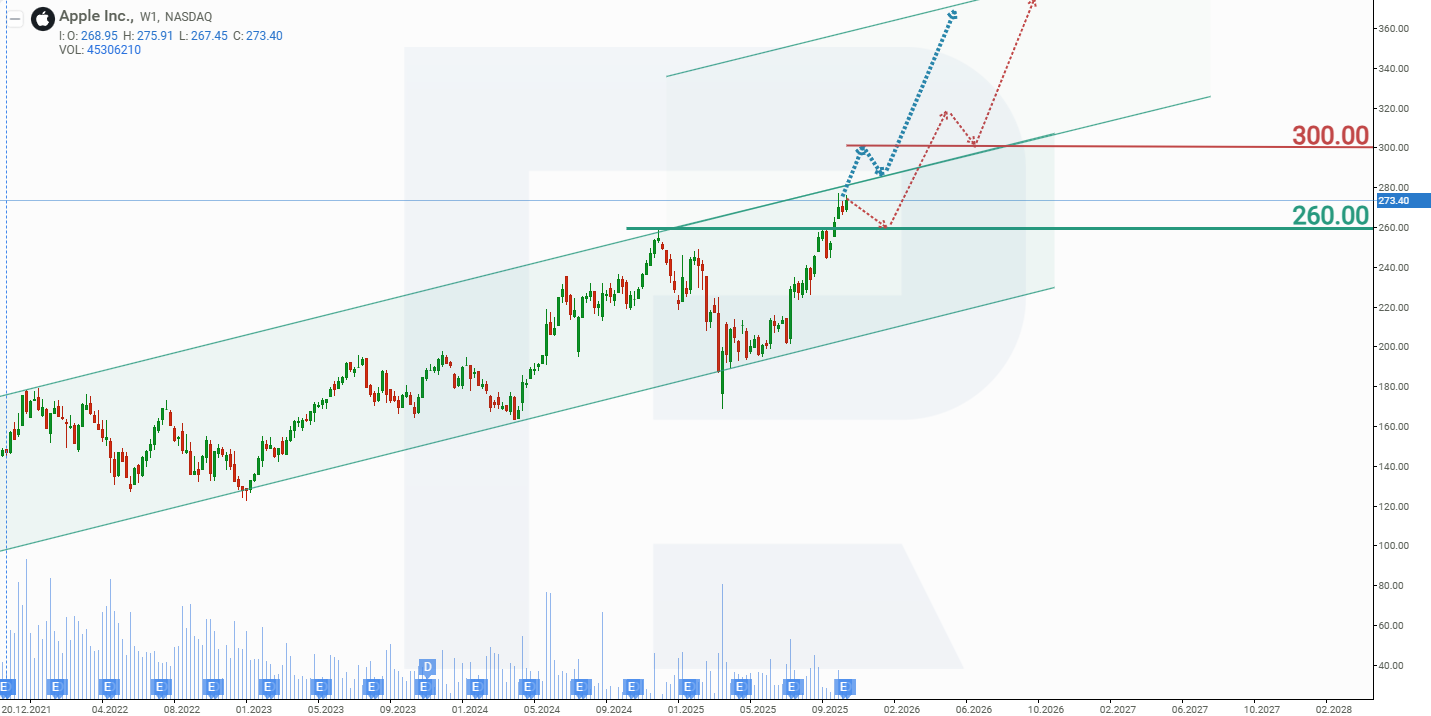 Апталық таймфреймде Apple акциялары өсім арнасында саудалануда және осы арнаның жоғарғы шекарасына жетті, ол қарсылық ретінде әрекет етеді. Тим Куктың 2025 жылғы тамызда Ақ үйге сапары AAPL акциялары бағасы мен компанияның қаржылық нәтижелеріне оң әсер етті. Нәтижесінде AAPL акциялары тамыз бен қараша аралығында шамамен 35%-ға өсті, айтарлықтай түзетулерсіз. Рекордтық тоқсан, келесі кезеңге арналған оптимистік guidance және мерекелік маусым алдында жаңа өнімдердің іске қосылуы AAPL акцияларының одан әрі өсуі үшін алғышарттар жасайды. Apple акцияларының ағымдағы динамикасына сүйене отырып, 2025 жылы AAPL бағасының ықтимал сценарийлері төмендегідей: