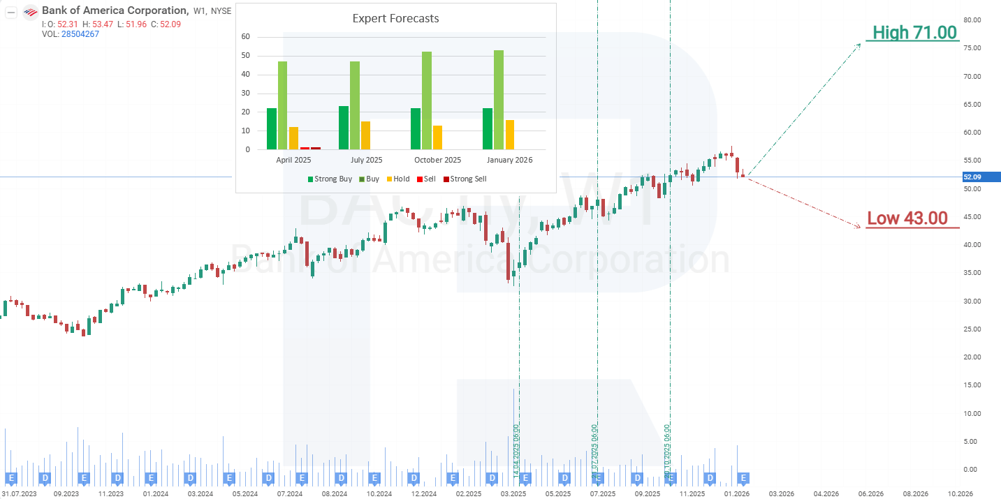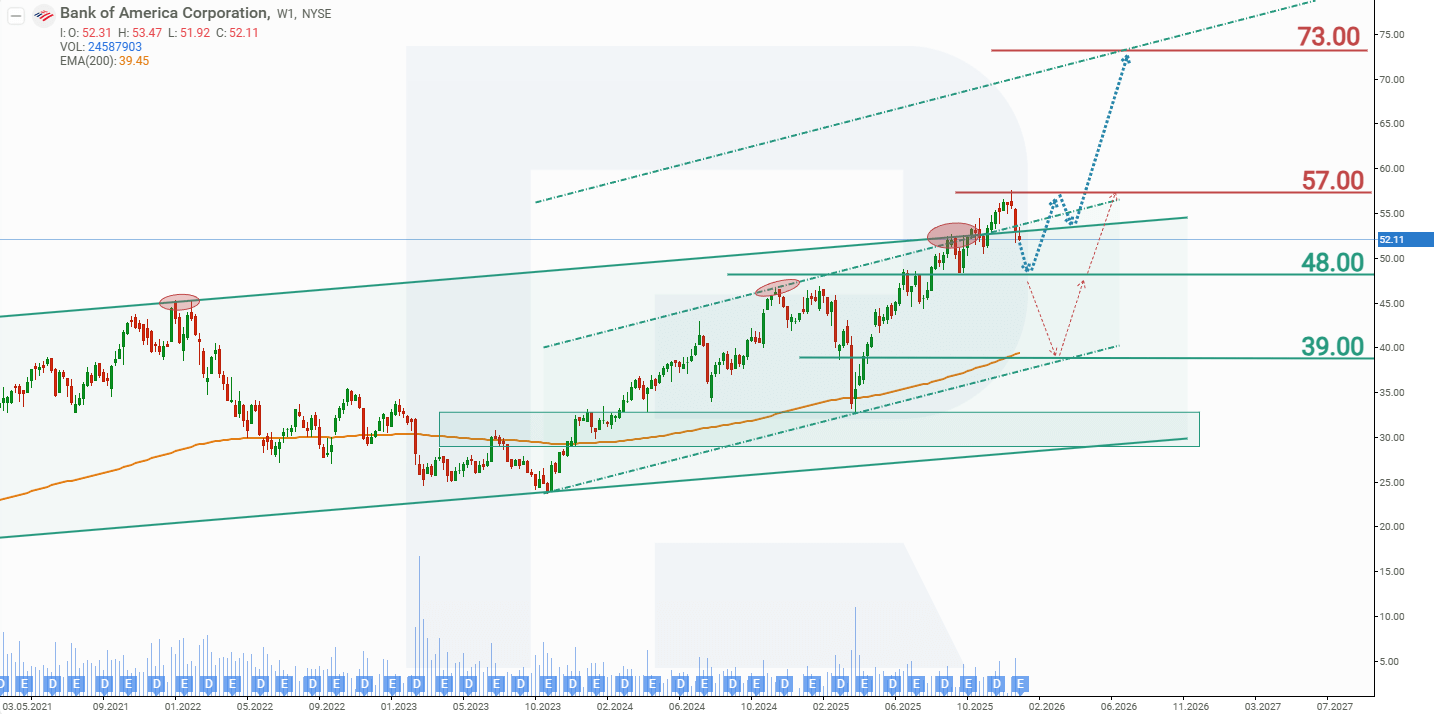 Апталық графикте Bank of America акциялары өсуші арнада саудаланып, қарсылық ретінде әрекет ететін жоғарғы шекараға жетті. Бұл деңгейден жоғары бұзып, бекіну әрекеті сәтсіз аяқталды, тіпті күтілгеннен жоғары болған тоқсандық есеп те өсімге серпін бере алмады. Бұл өсуші трендтің жалғасуы алдында түзетудің қажеттігін көрсетеді. BAC акцияларының ағымдағы динамикасына сүйене отырып, 2026 жылға арналған ықтимал баға сценарийлері төмендегідей: