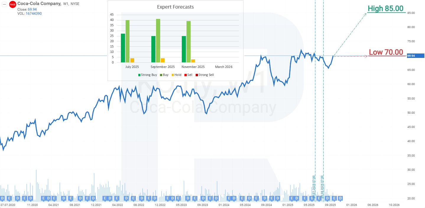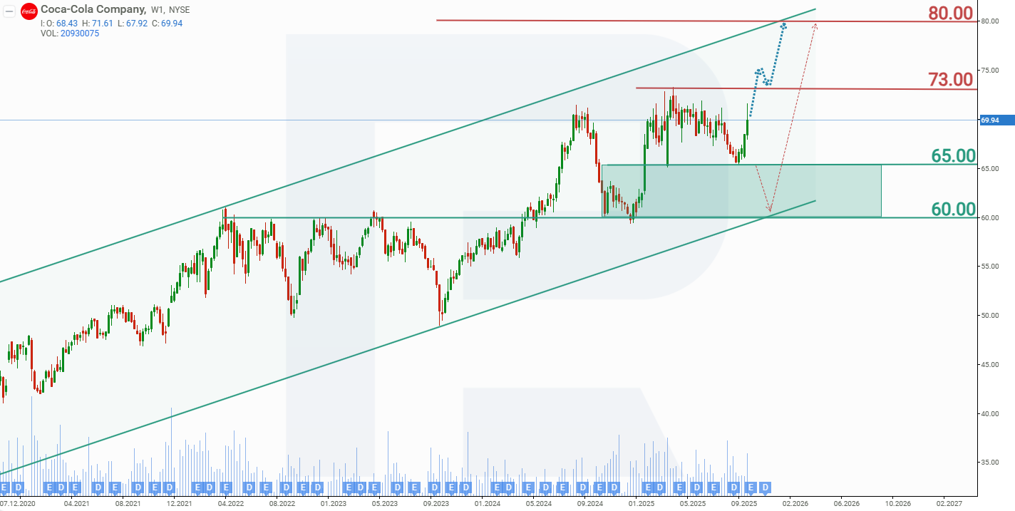 Апталық таймфреймде The Coca-Cola Company акциялары өсім арнасында саудалануды жалғастыруда. 2025 жылдың 3-тоқсан есебінің жариялануы инвестор сұранысын арттырды – мұндай өсім соңғы екі тоқсанда байқалмаған. Есеп шыққаннан кейін акция бағасы шамамен 4%-ға өсті. Осы жағдай аясында 73 АҚШ долларындағы тарихи максимумнан жоғары бұзылу ықтималдығы артты. Ағымдағы баға динамикасына сүйене отырып, 2025 жылы The Coca-Cola Company акциялары үшін ықтимал сценарийлер келесідей: