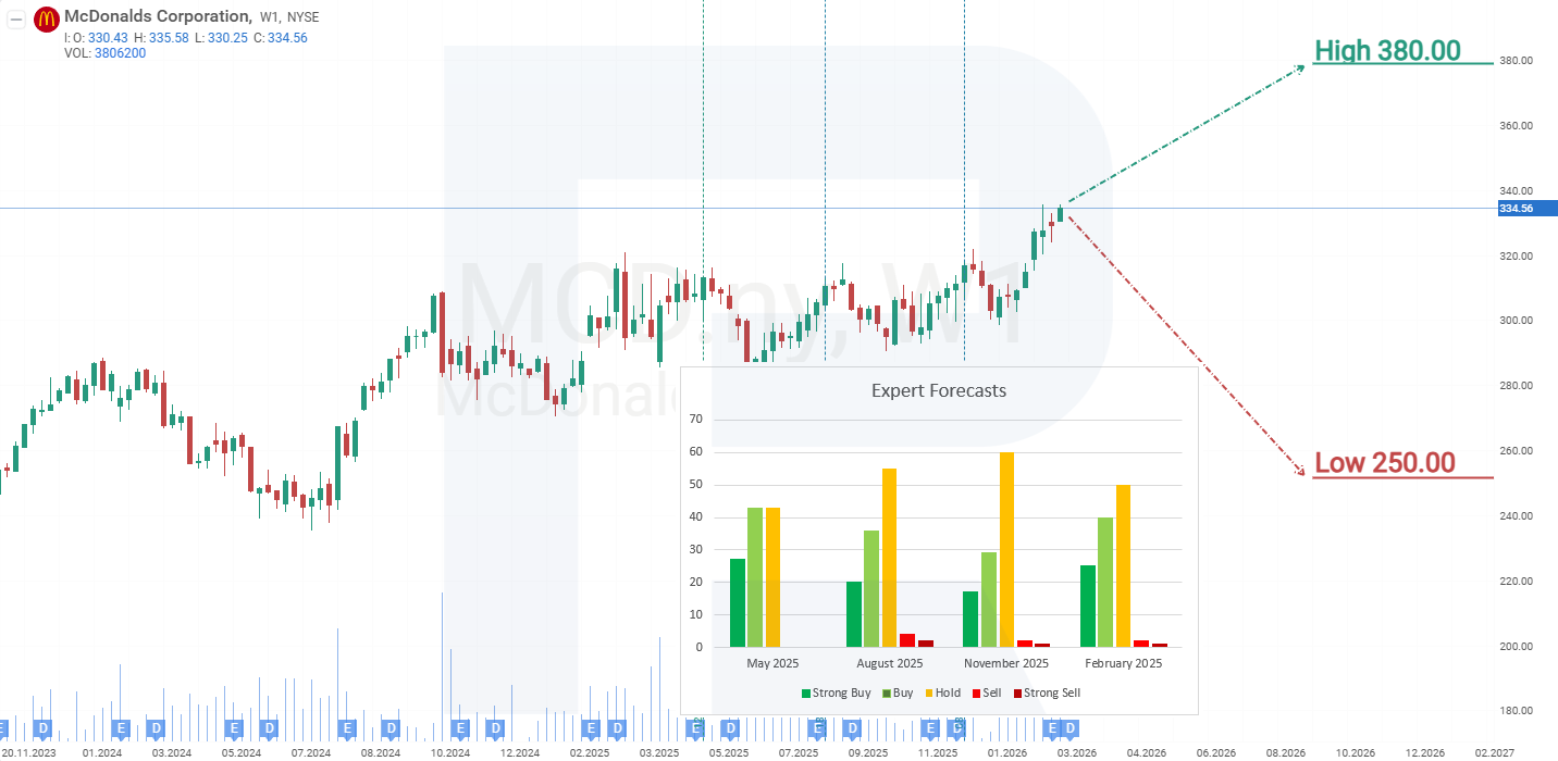 Апталық графикте McDonald's акциялары өсім арнасында саудалануда және шамамен 320 АҚШ доллары деңгейіндегі тарихи максимумға үшінші рет жақындап қалды. Компанияның қаржылық жағдайы мықты әрі күрделі кезеңдерден өту қабілеті дәлелденгенін ескерсек, бұл жолы бағаның бұрынғы максимумнан жоғары өту ықтималдығы жоғары. McDonald's Corporation акцияларының ағымдағы динамикасына сүйене отырып, 2025 жылға арналған баға сценарийлері төмендегідей: