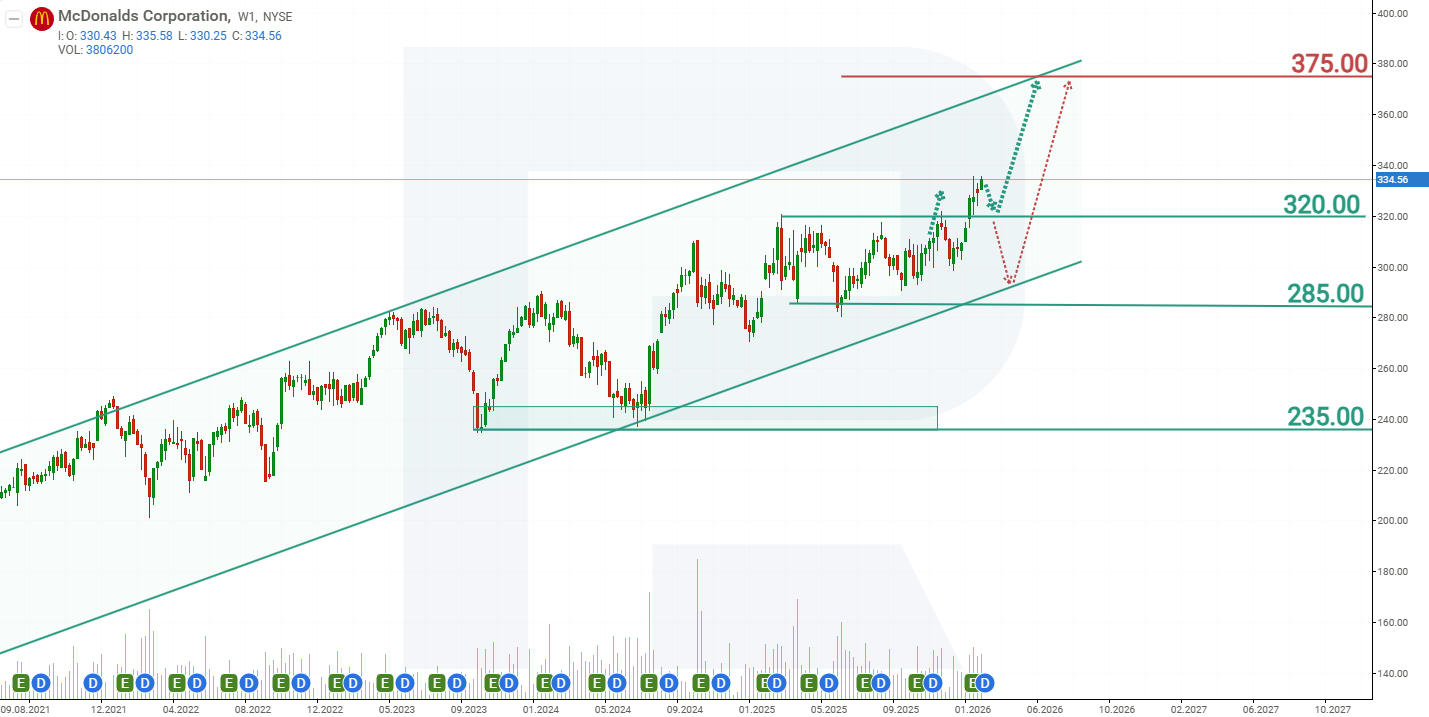 McDonald's Corporation акцияларына базалық сценарий 320 АҚШ доллары деңгейіндегі қарсылықтан жоғары бұзылуды және одан әрі арнаның жоғарғы шекарасы – 370 АҚШ доллары бағытында өсуін болжайды.