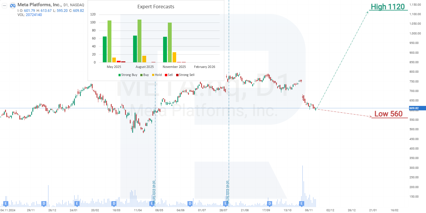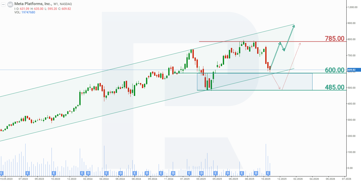 Негізгі (base-case) болжам бойынша Meta Platforms акциялары 600 АҚШ долларындағы қолдаудан қайта серпіледі, бұл түзетудің аяқталғанын және өсу трендінің жалғасқанын білдіреді. Келесі мақсат — 785 АҚШ доллары деңгейіндегі қарсылық. Егер бұл деңгей бұзылса, баға арнаның жоғарғы шекарасына — 900 АҚШ долларына дейін өсуі мүмкін.