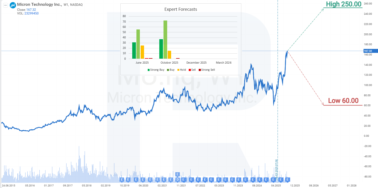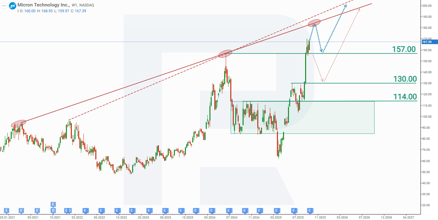 Сәуір айында Micron Technology NVIDIA (NASDAQ: NVDA) үшін HBM3E чиптерін жаппай өндіріске кіріскені жарияланғаннан кейін MU акциялары күрт өсті. Сәуірден қазан 2025-ке дейін акция 160%-ға көтеріліп, бұрынғы 157 АҚШ доллары тарихи максимумын бұзып өтті және қазір 185 АҚШ доллары маңындағы қарсылық сызығына жақындап қалды. Micron акцияларының ағымдағы динамикасын ескере отырып, 2025 жылға арналған екі ықтимал сценарий төмендегідей: