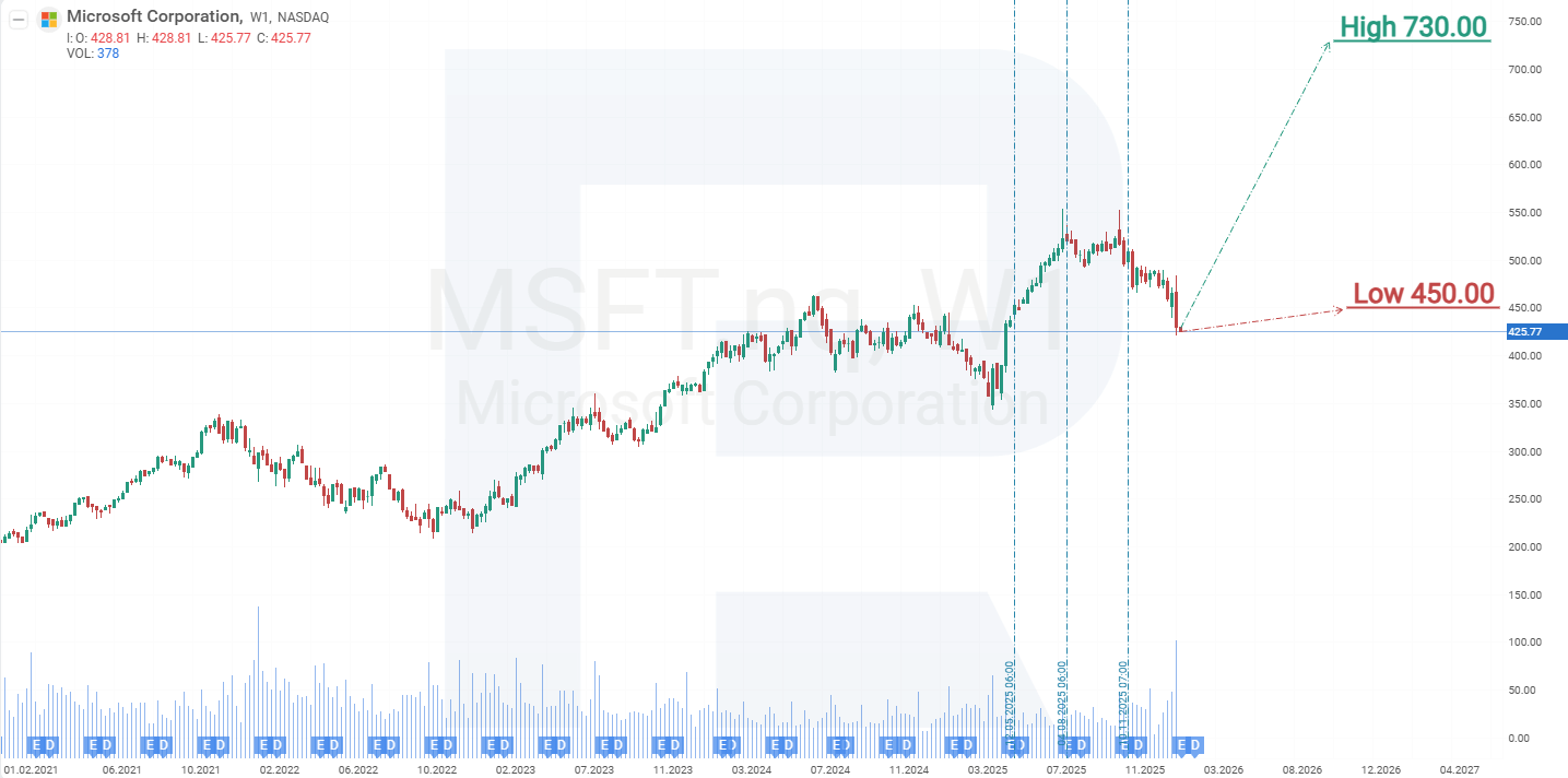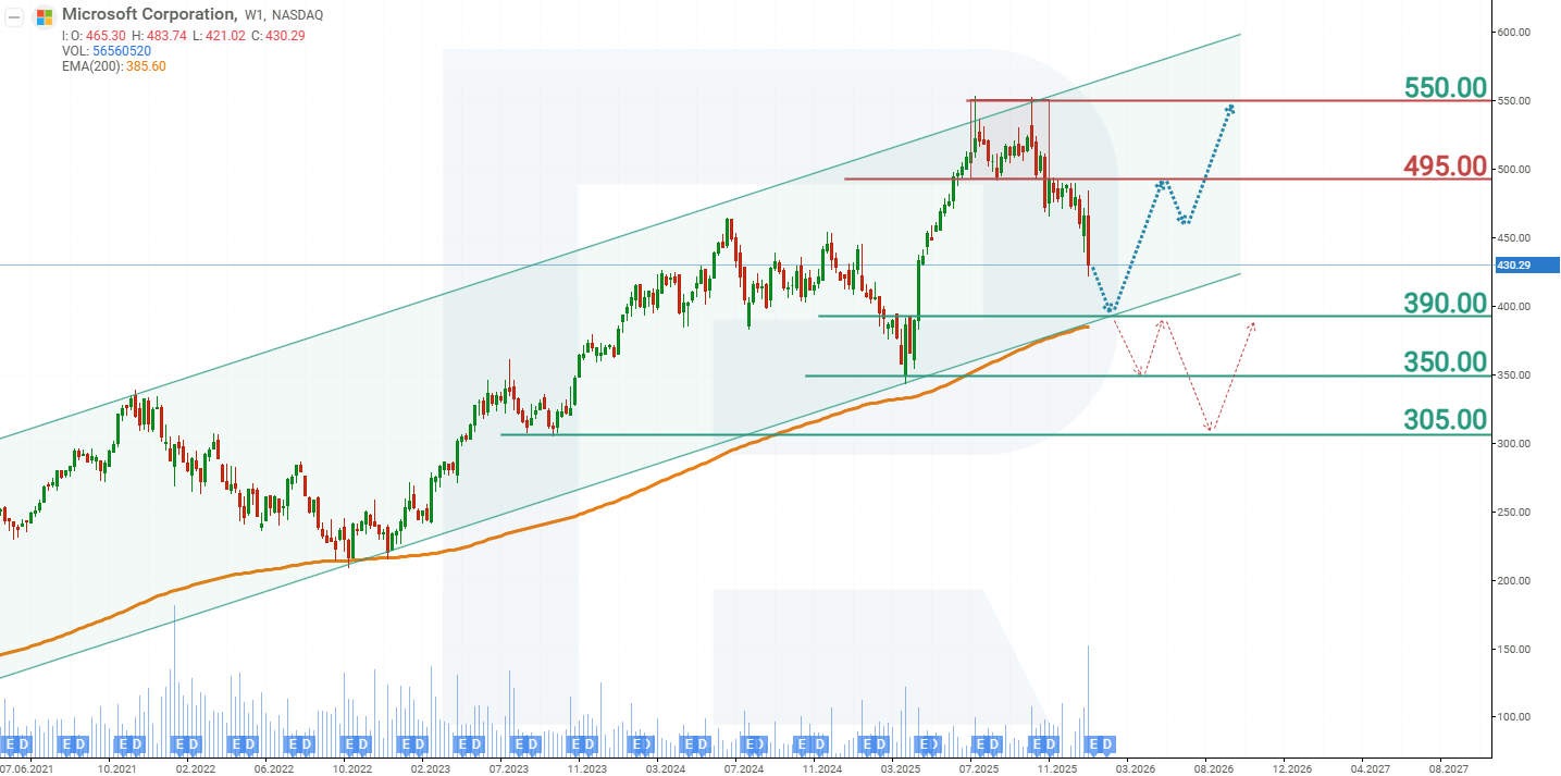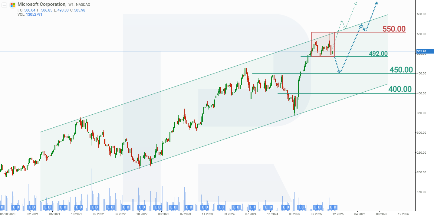 Microsoft Corporation акциялары үшін базалық сценарий 492 АҚШ доллары деңгейіндегі қолдаудан төмен бұзылуды болжайды, бұл Double Top үлгісі аясында MSFT-тің 450 АҚШ долларына дейін төмендеуіне сигнал береді. Осы деңгейде MSFT акцияларындағы түзету аяқталуы мүмкін, бұған 450 АҚШ доллары қолдауынан ықтимал серпілу меңзейді. Бұл жағдайда MSFT қайтадан өсуші арнаның жоғарғы шекарасына – 580 АҚШ долларына қарай қозғала алады. Егер арнаның жоғарғы сызығы жоғары бұзылса, келесі өсу мақсаты сарапшылар болжаған максималды деңгей – 730 АҚШ доллары болуы мүмкін.