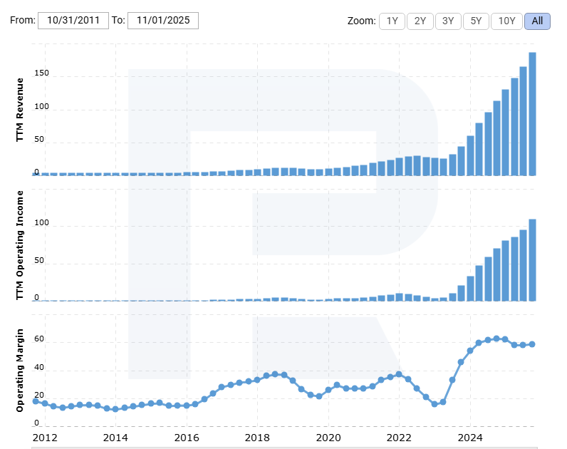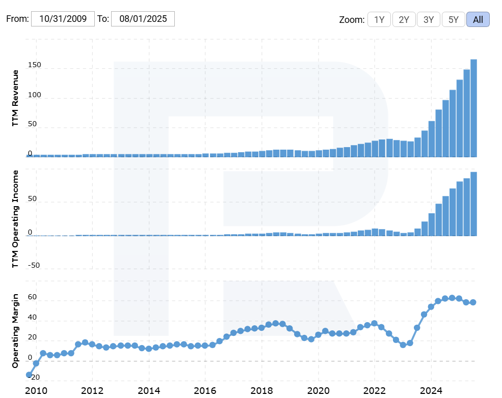 NVIDIA есебінің іргелі талдауы барлық сегменттер бойынша кірістің артқанын көрсетті. ЖИ технологияларына бағытталған Data Center сегменті көшбасшы болып қала берді. Төмендегі компанияның операциялық маржасының диаграммасы ЖИ-дің NVIDIA көрсеткіштеріне қаншалықты әсер еткенін көрсетеді.